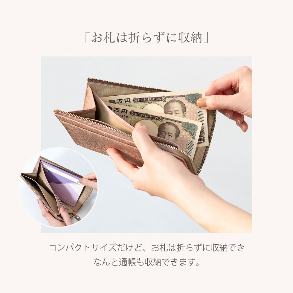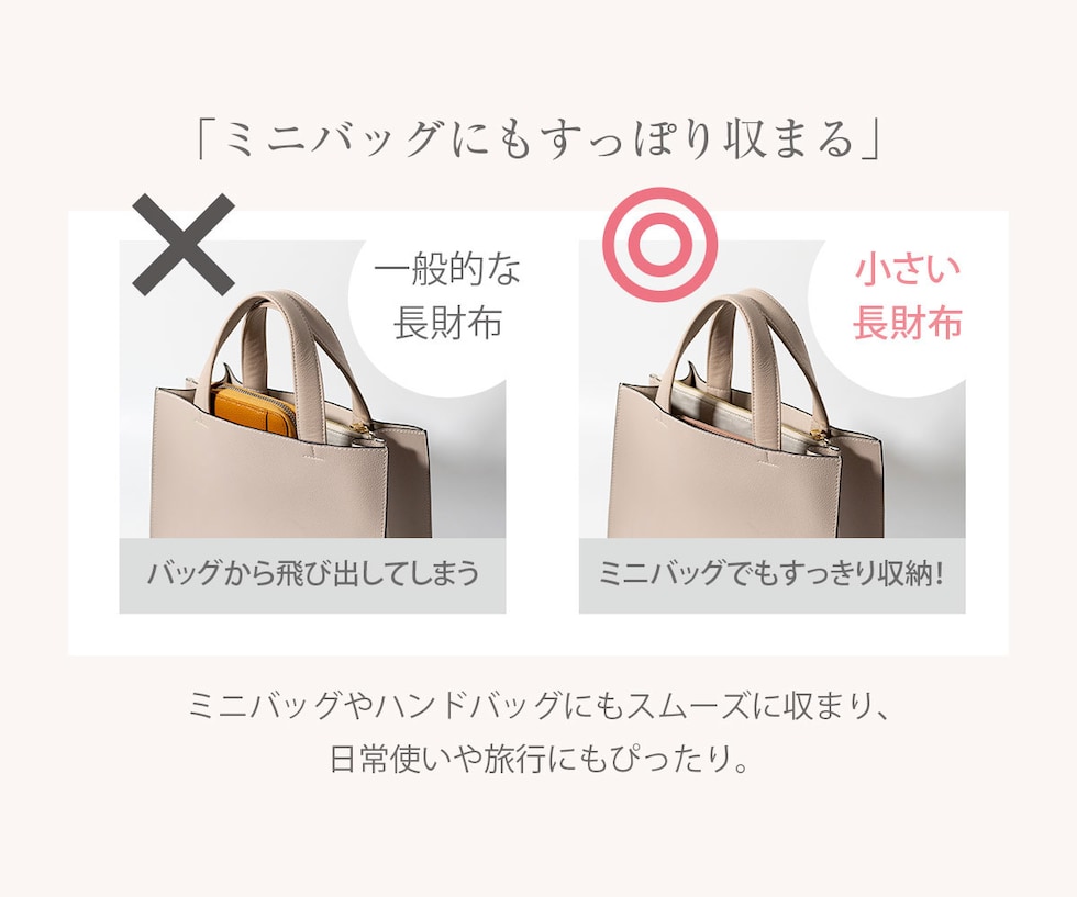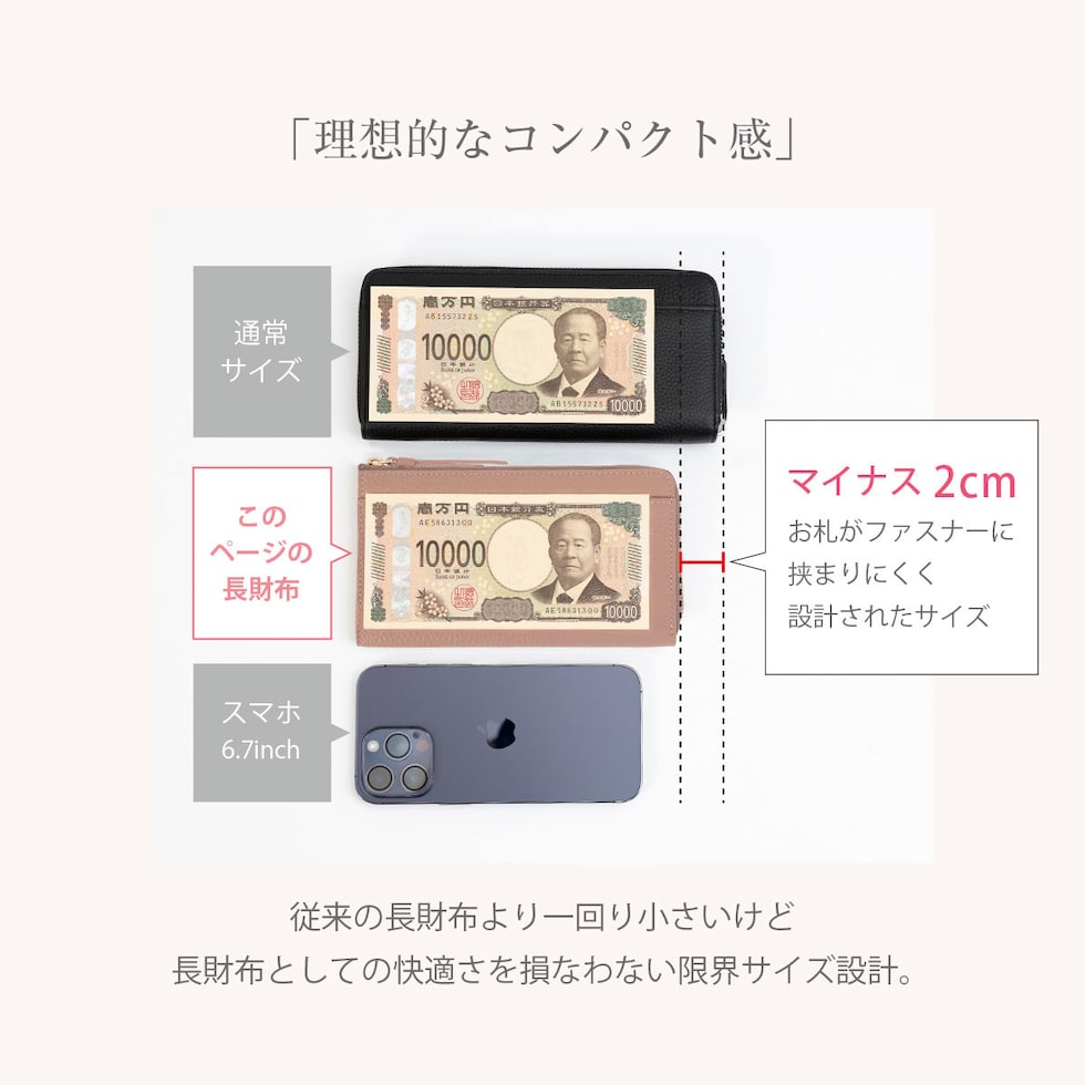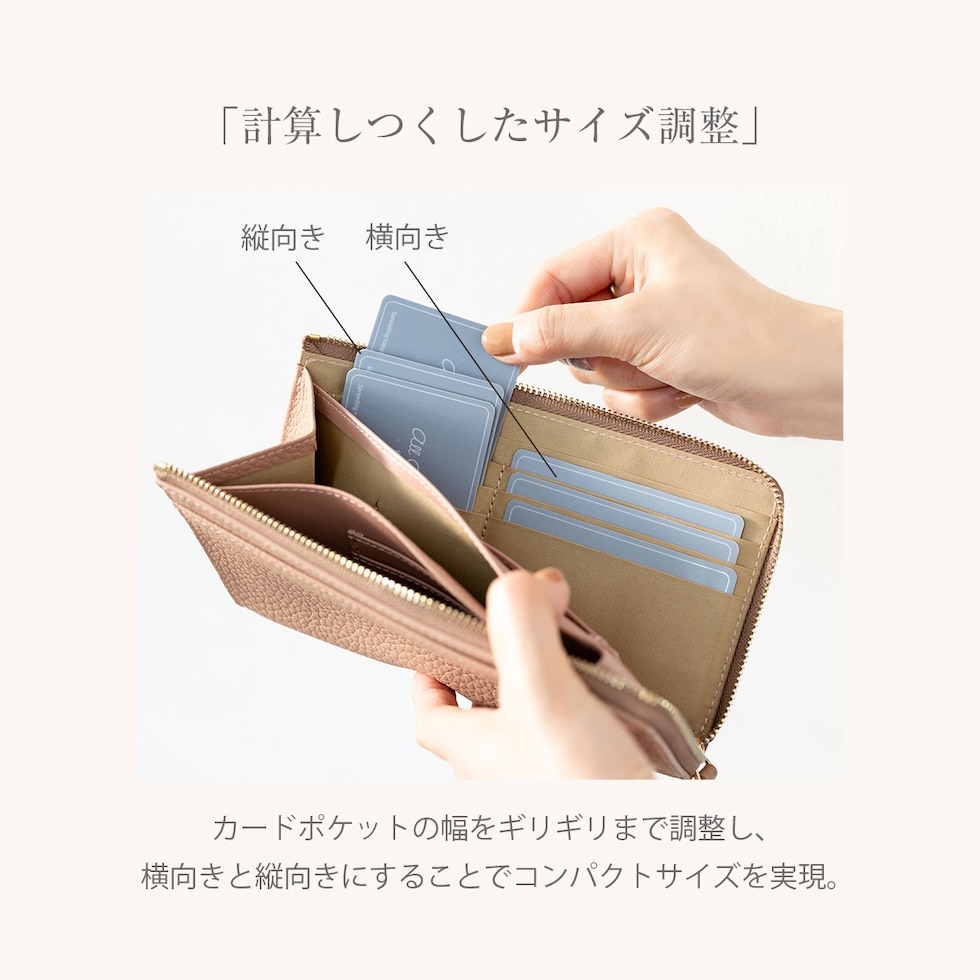ロングウォレットの快適さを保ちつつ限界までサイズをおさえた、”いいとこどり” のお財布です。