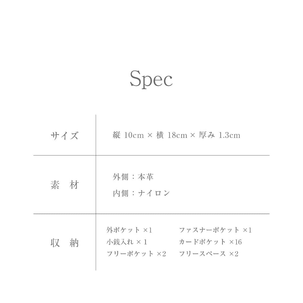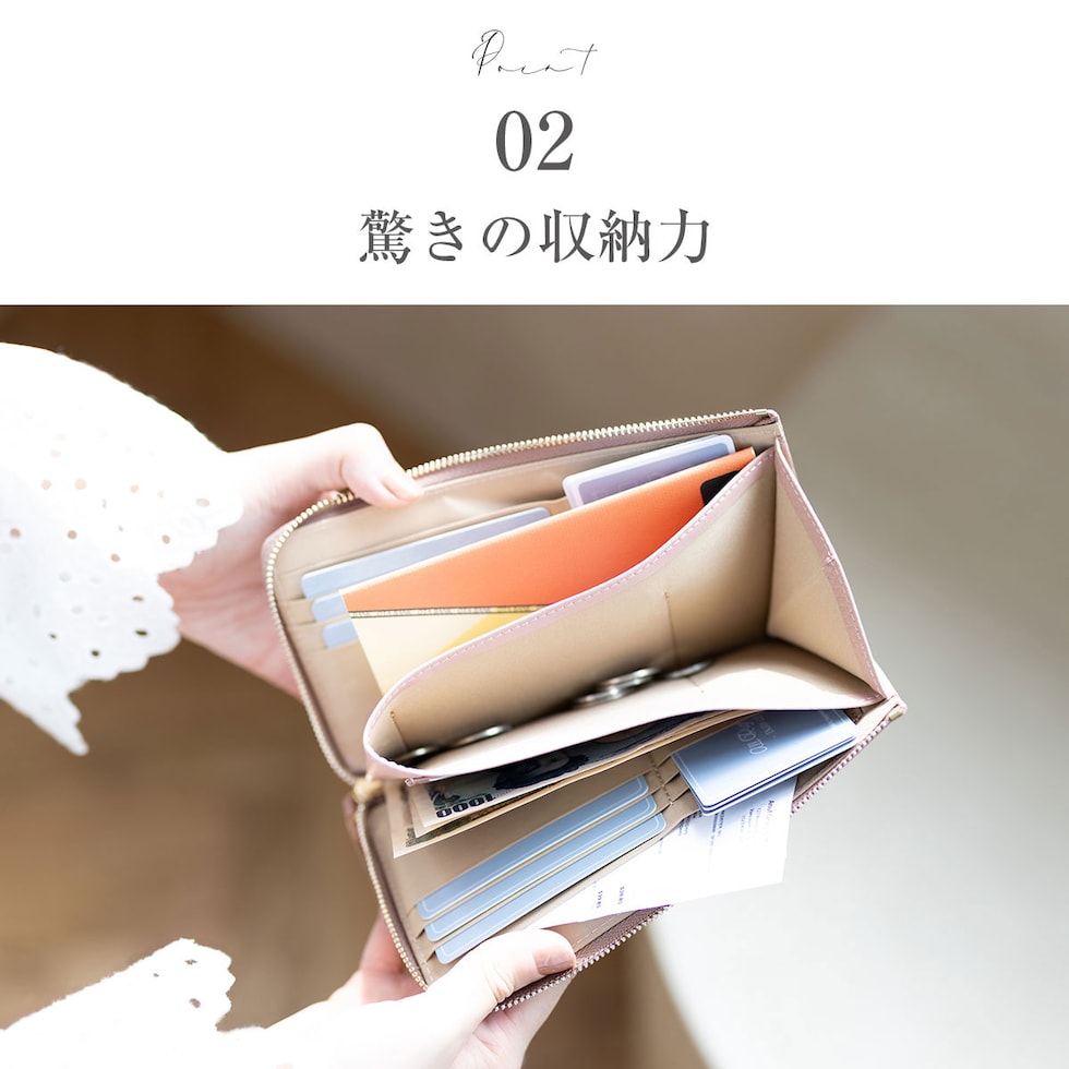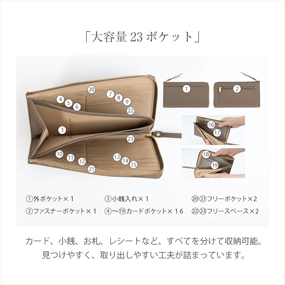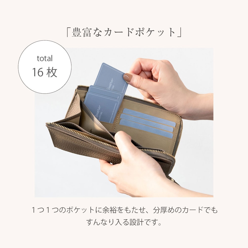 小さめバッグに収まるサイズ感ながら、16箇所のカードポケット+4つのフリーポケットを配置。お札も折らずに入ります。