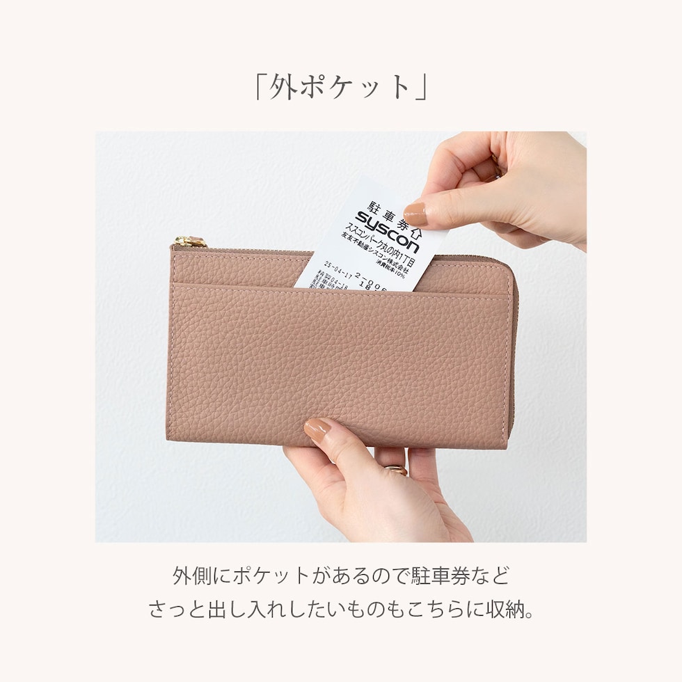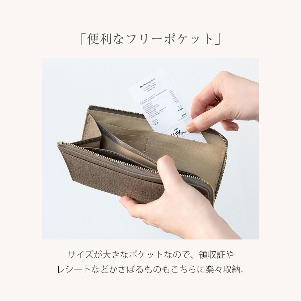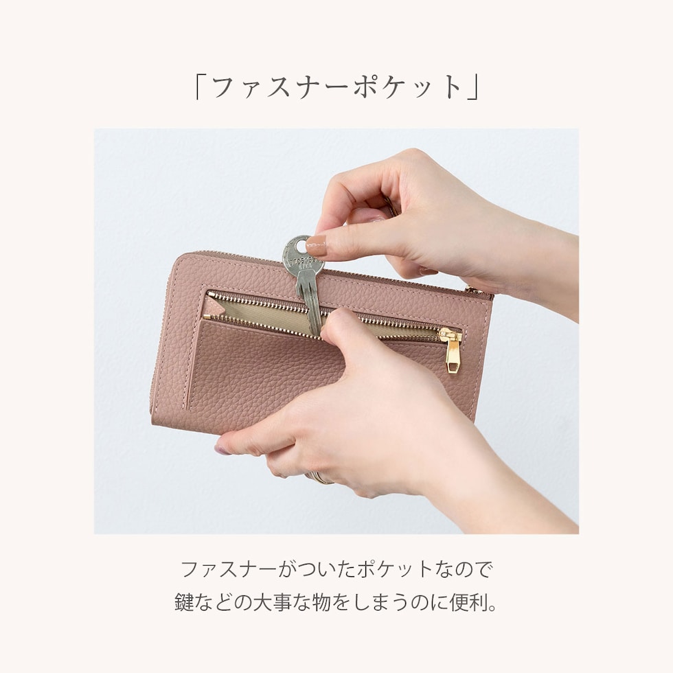 鍵やお守り、切符や一時的にしまう領収書などファスナーが無いと心配な物をサッと収納。アクセスが良いので、お会計時のレシートやクーポン券、映画や劇団のチケットなどの収納に最適!財布内側、小銭入れ側面についたカードポケットで自分好みに収納、整理が簡単で見つけやすい◎