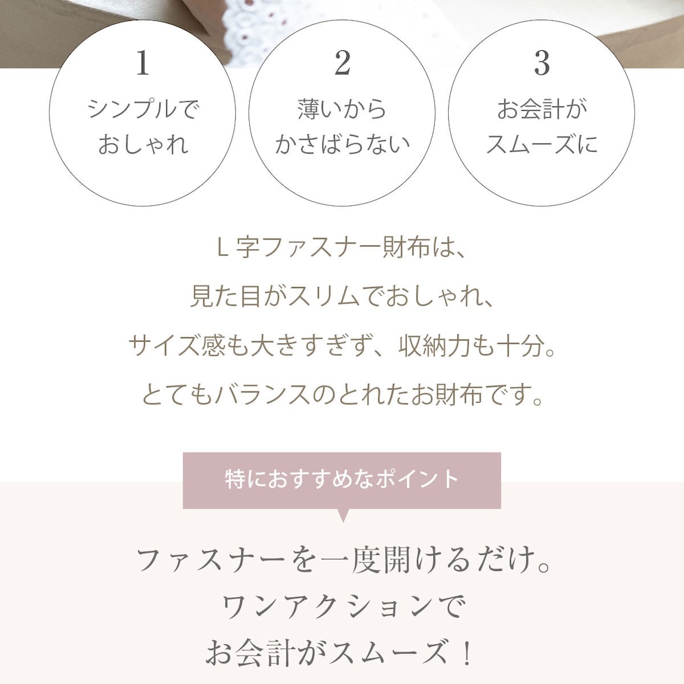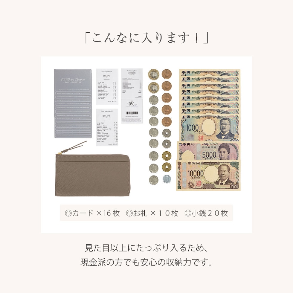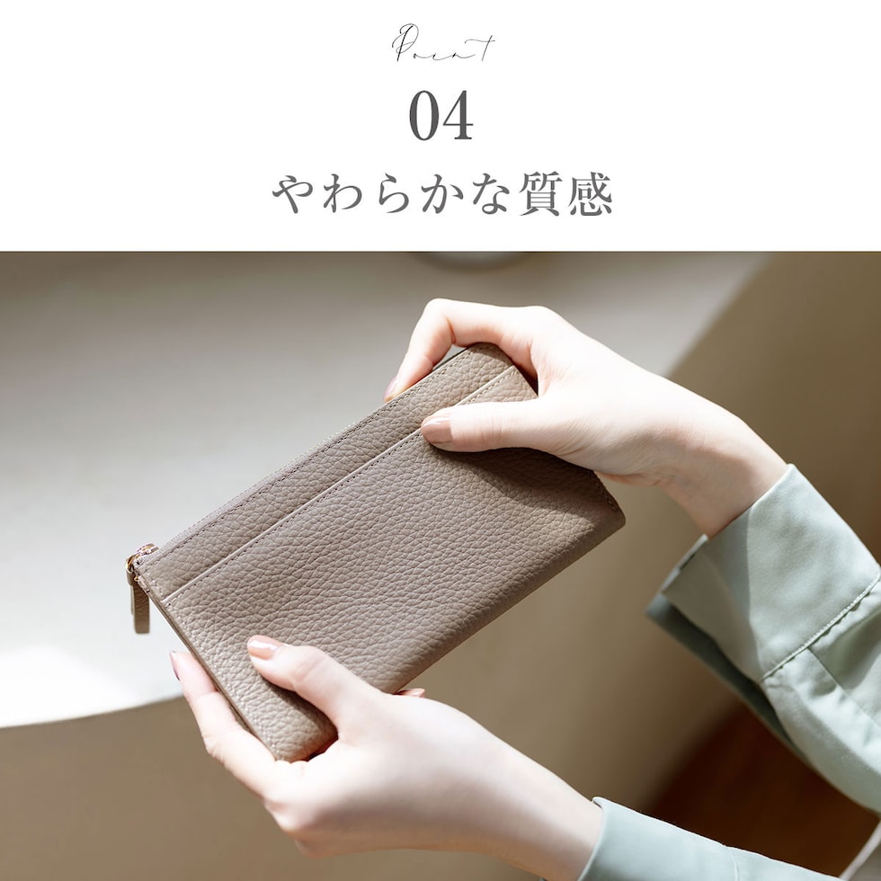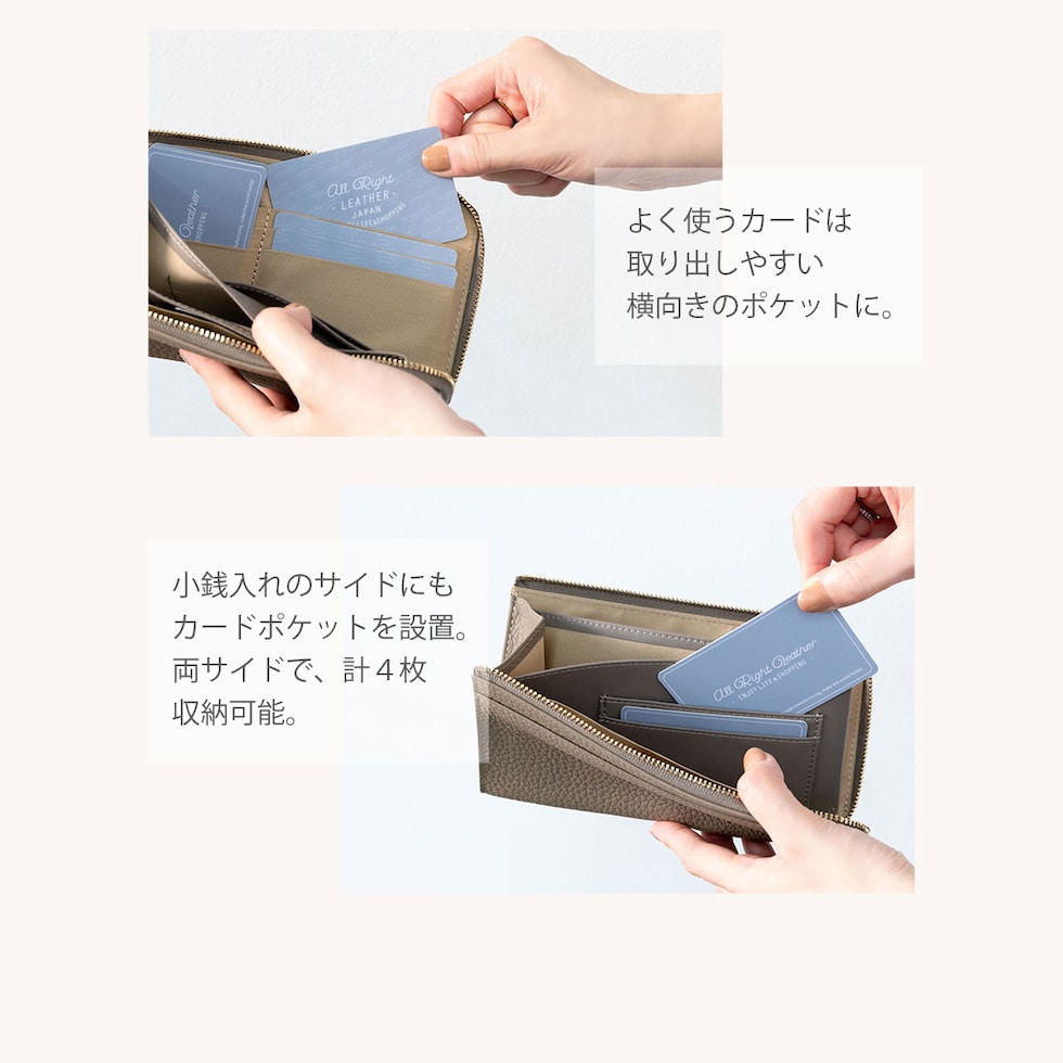 鍵やお守り、切符や一時的にしまう領収書などファスナーが無いと心配な物をサッと収納。アクセスが良いので、お会計時のレシートやクーポン券、映画や劇団のチケットなどの収納に最適!財布内側、小銭入れ側面についたカードポケットで自分好みに収納、整理が簡単で見つけやすい◎