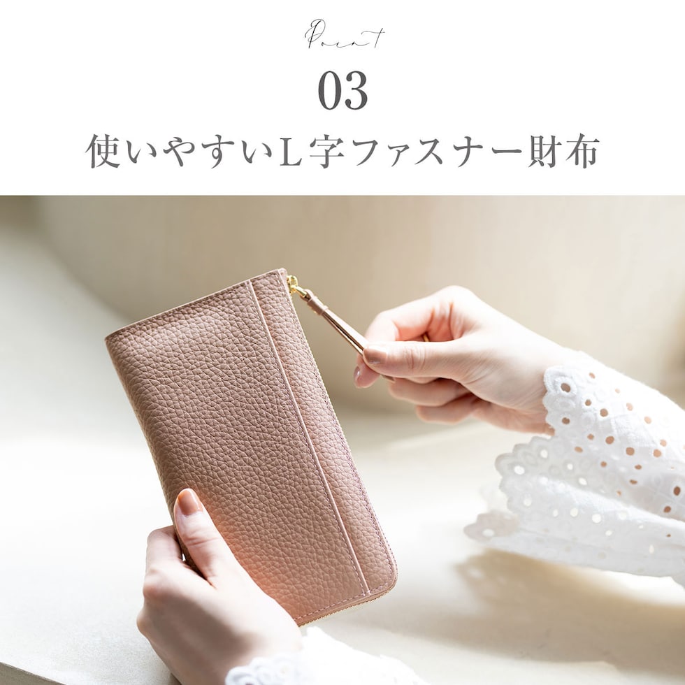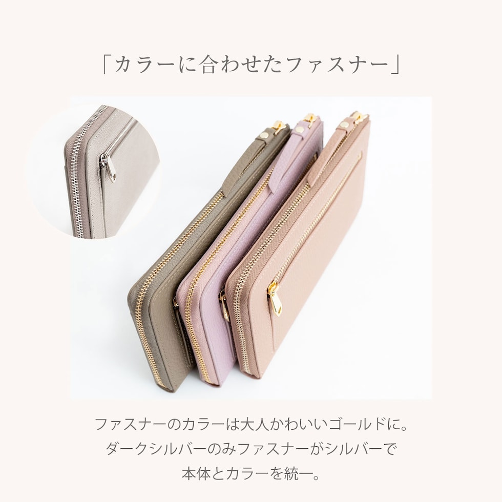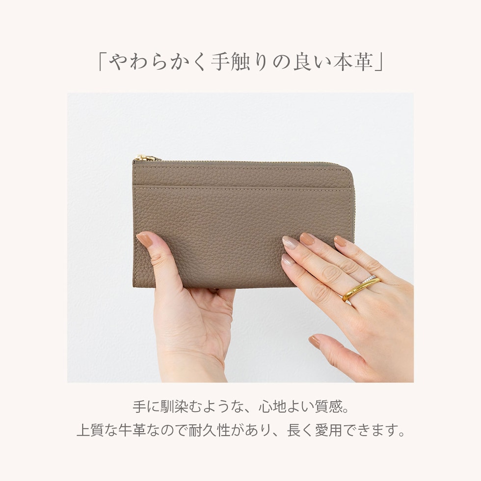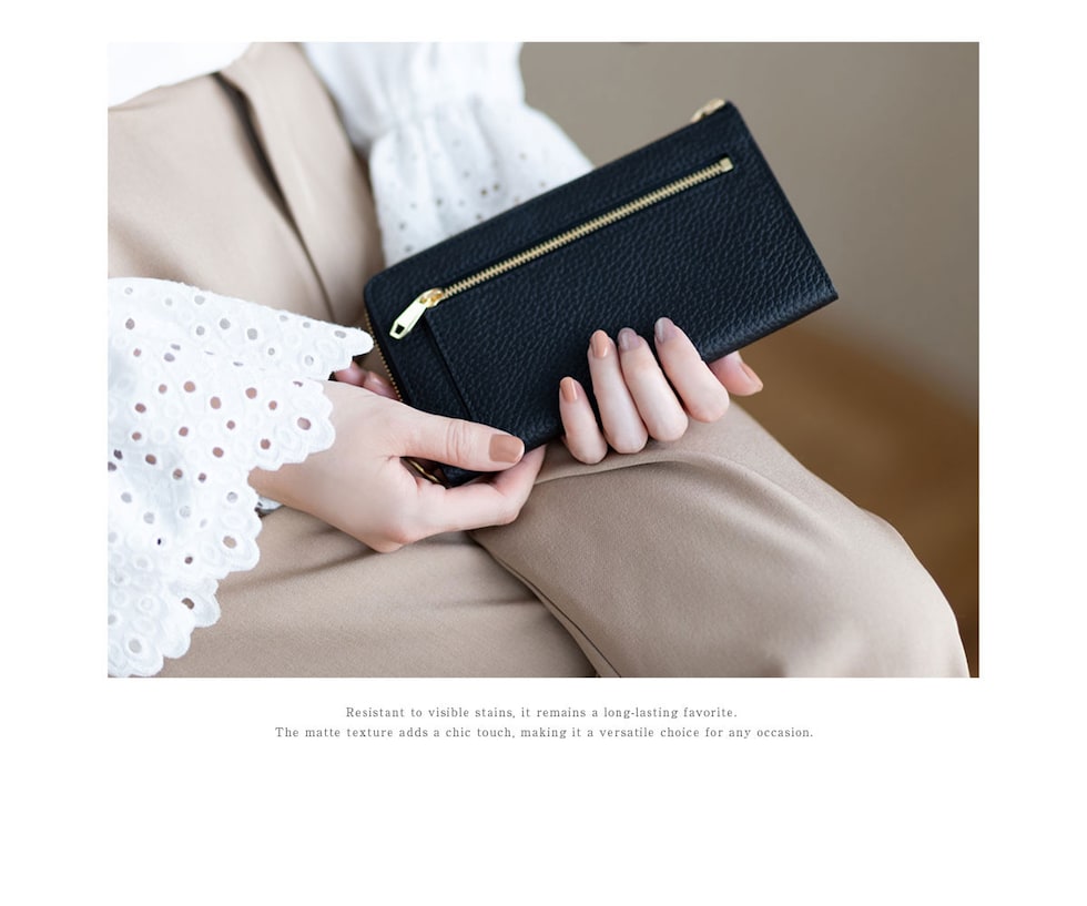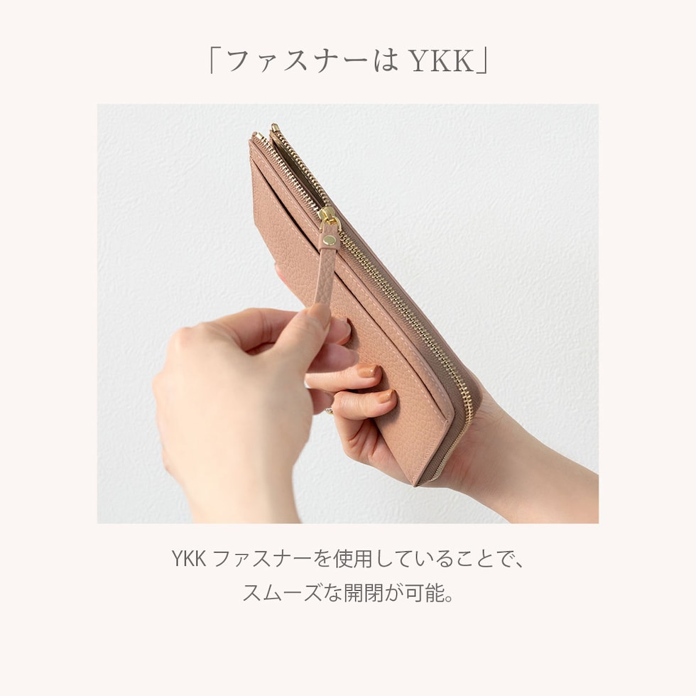 表地には上品で優しい手ざわりの本革シュリンクレザー、ファスナーは安心のYKK製。
