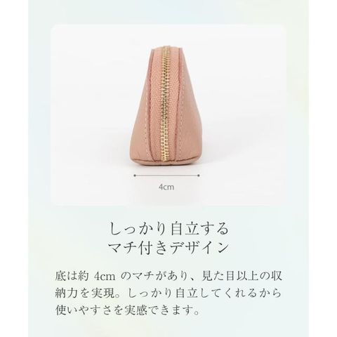 手のひらサイズにこだわりを詰め込んだマルチポーチです。底面はマチ付きでしっかり自立し、見た目以上の大容量。ラウンド形状のファスナーが大きく開いて見やすさも◎ 内側の両サイドにはフリーポケット付きで、すっきり整頓できます。