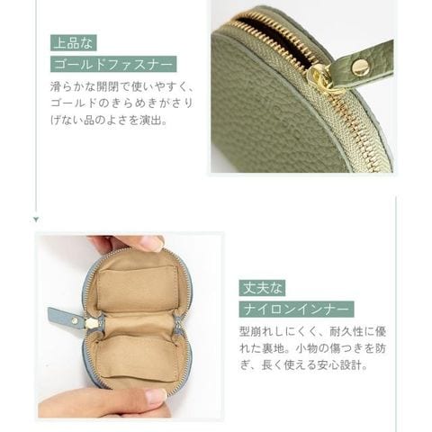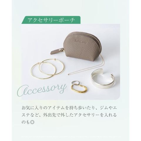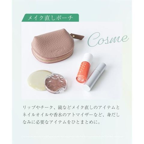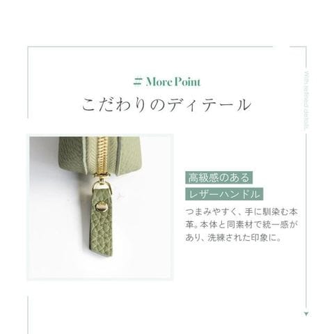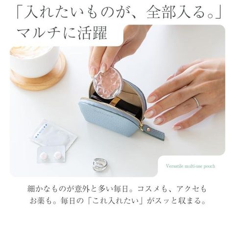 表地には柔らかなシボ感が手に優しい牛本革を使用しています。シンプルで上品なたたずまいは、幅広いスタイルに馴染みます。リップやアクセサリー、イヤフォンや常備薬など、お好みのアイテムをひとまとめに。