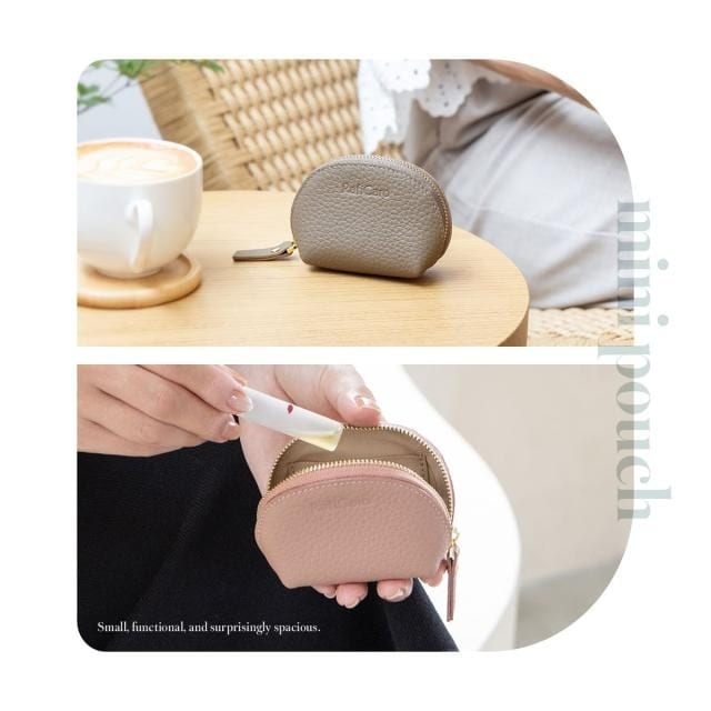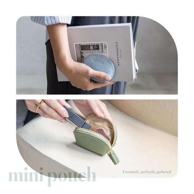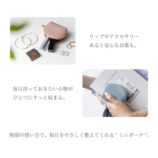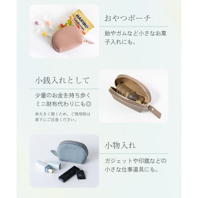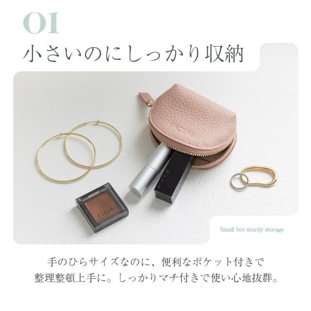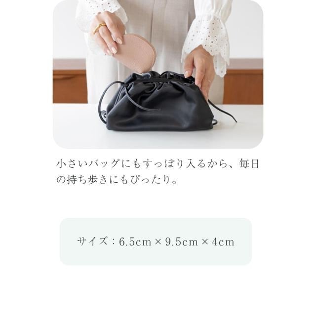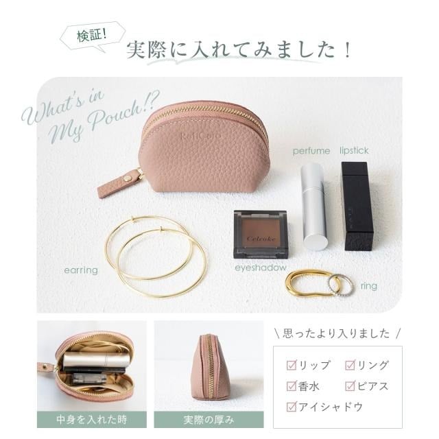 表地には柔らかなシボ感が手に優しい牛本革を使用しています。シンプルで上品なたたずまいは、幅広いスタイルに馴染みます。リップやアクセサリー、イヤフォンや常備薬など、お好みのアイテムをひとまとめに。