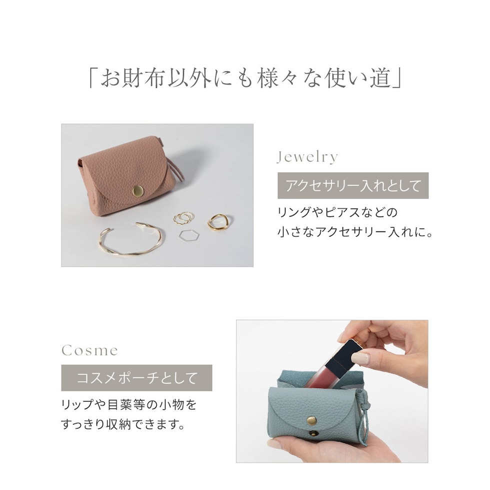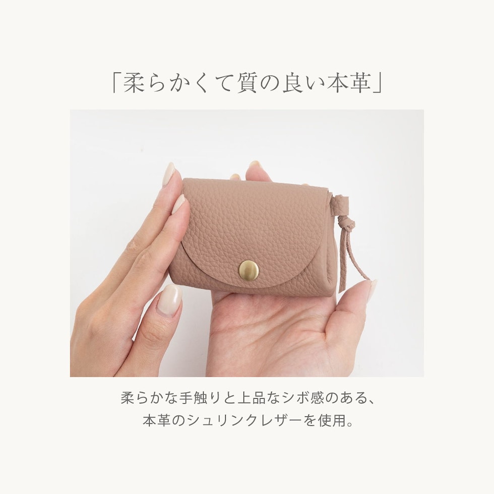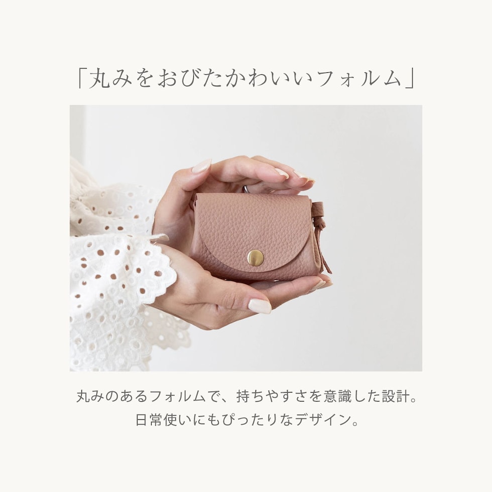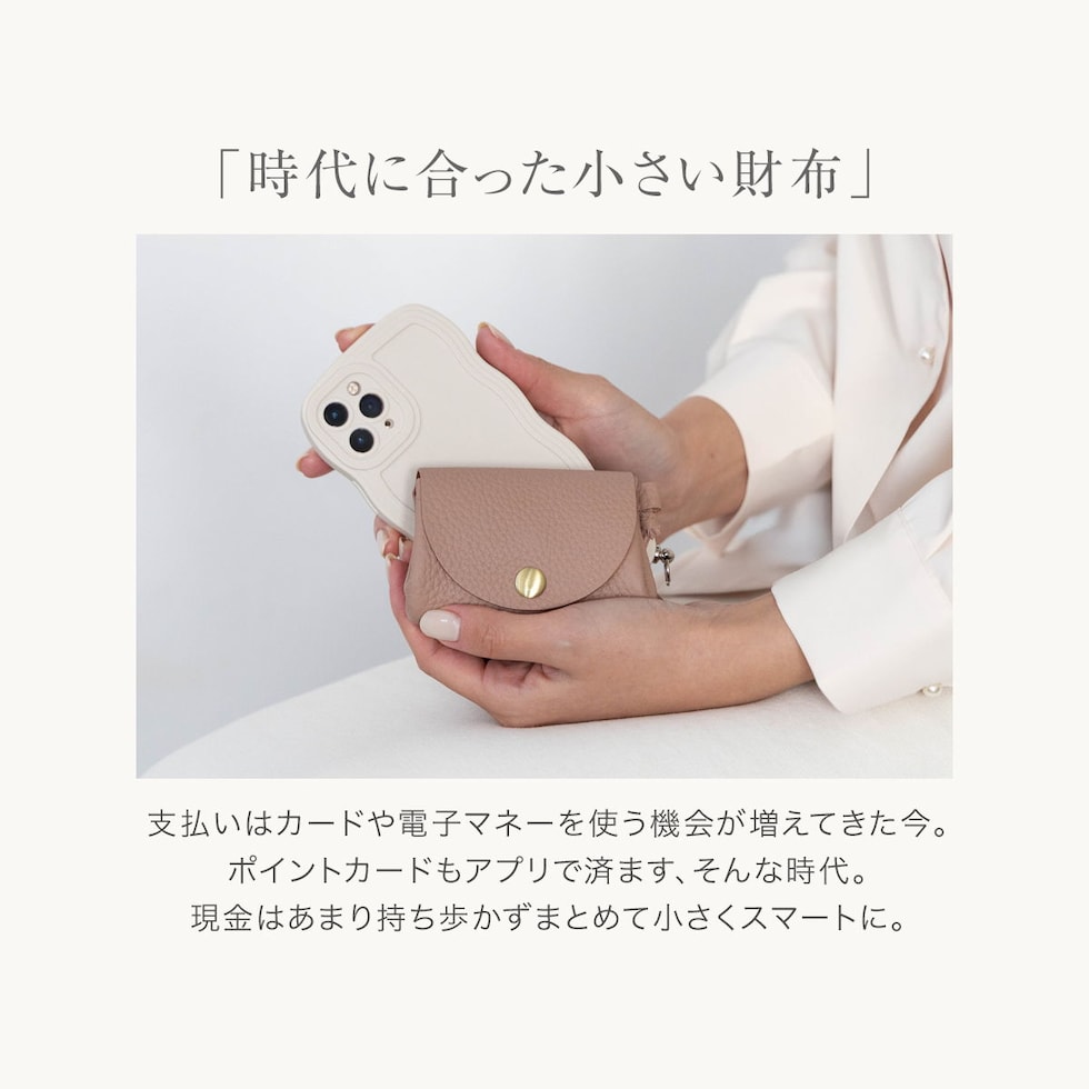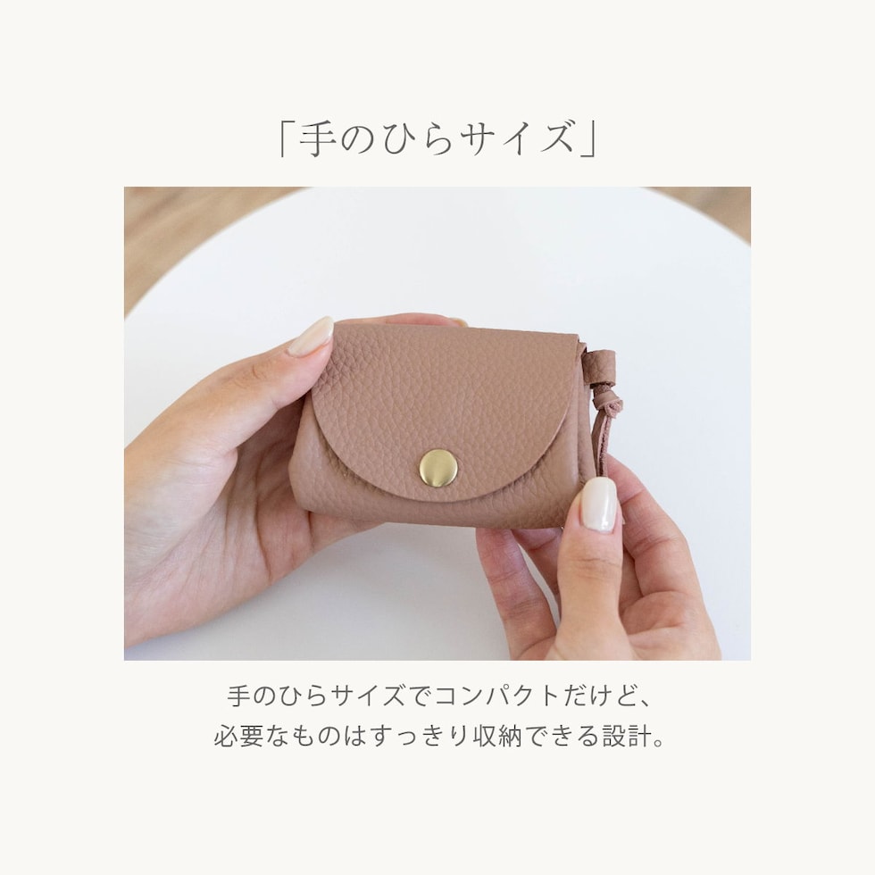 手のひらサイズがかわいいミニウォレットです。毎日持ち歩いてほしいから、きちんと感のある上質な本革を使用しました。柔らかく手に馴染む使い心地です。
