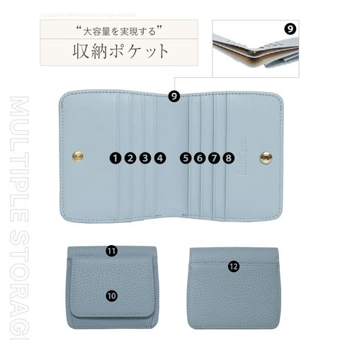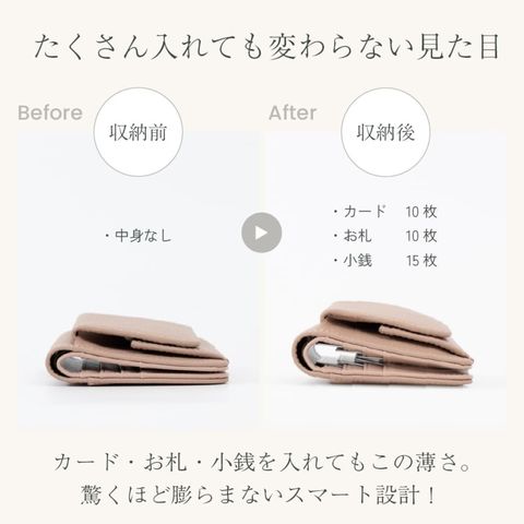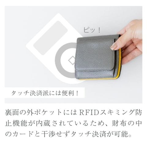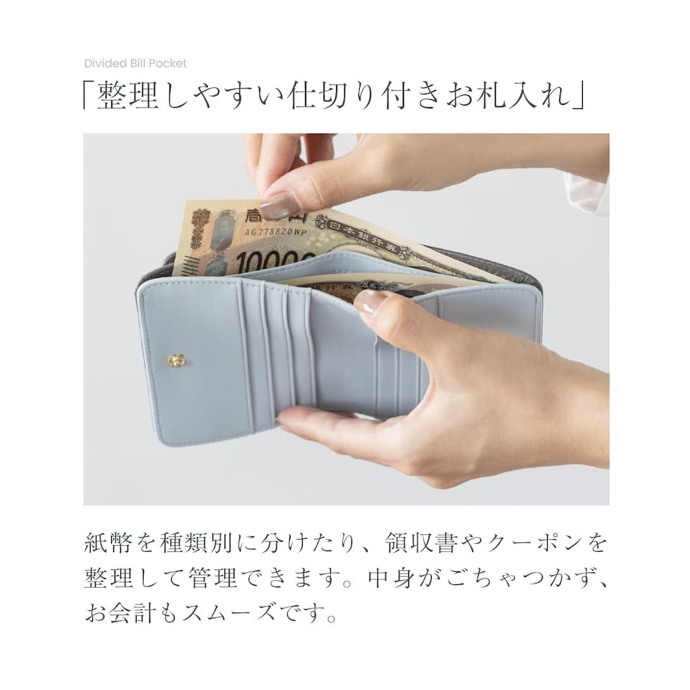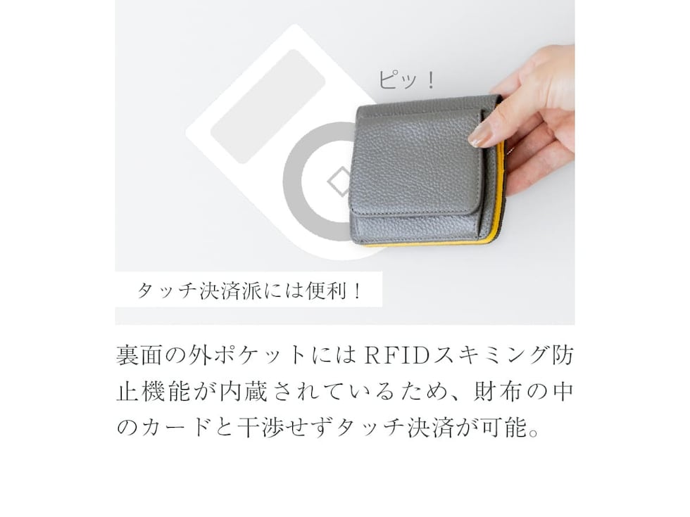 カードはたっぷり10枚収納。仕切り付きのお札入れに、小銭入れは人気のボックス型。たくさん入れても厚みの出にくいスマート設計です。外ポケットとの境目にはRFIDブロック素材を施し、タッチ決済もスムーズに。