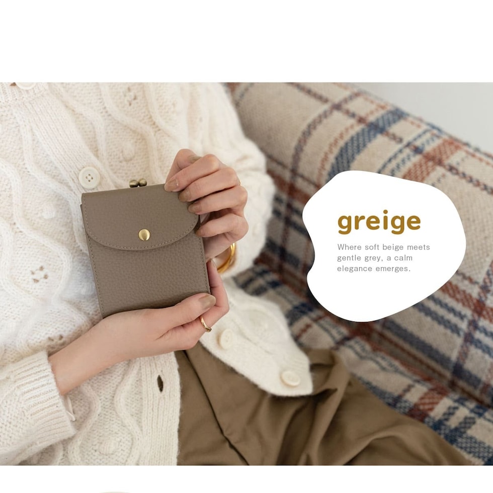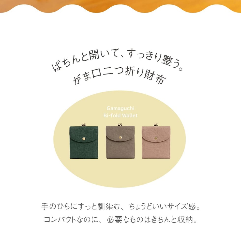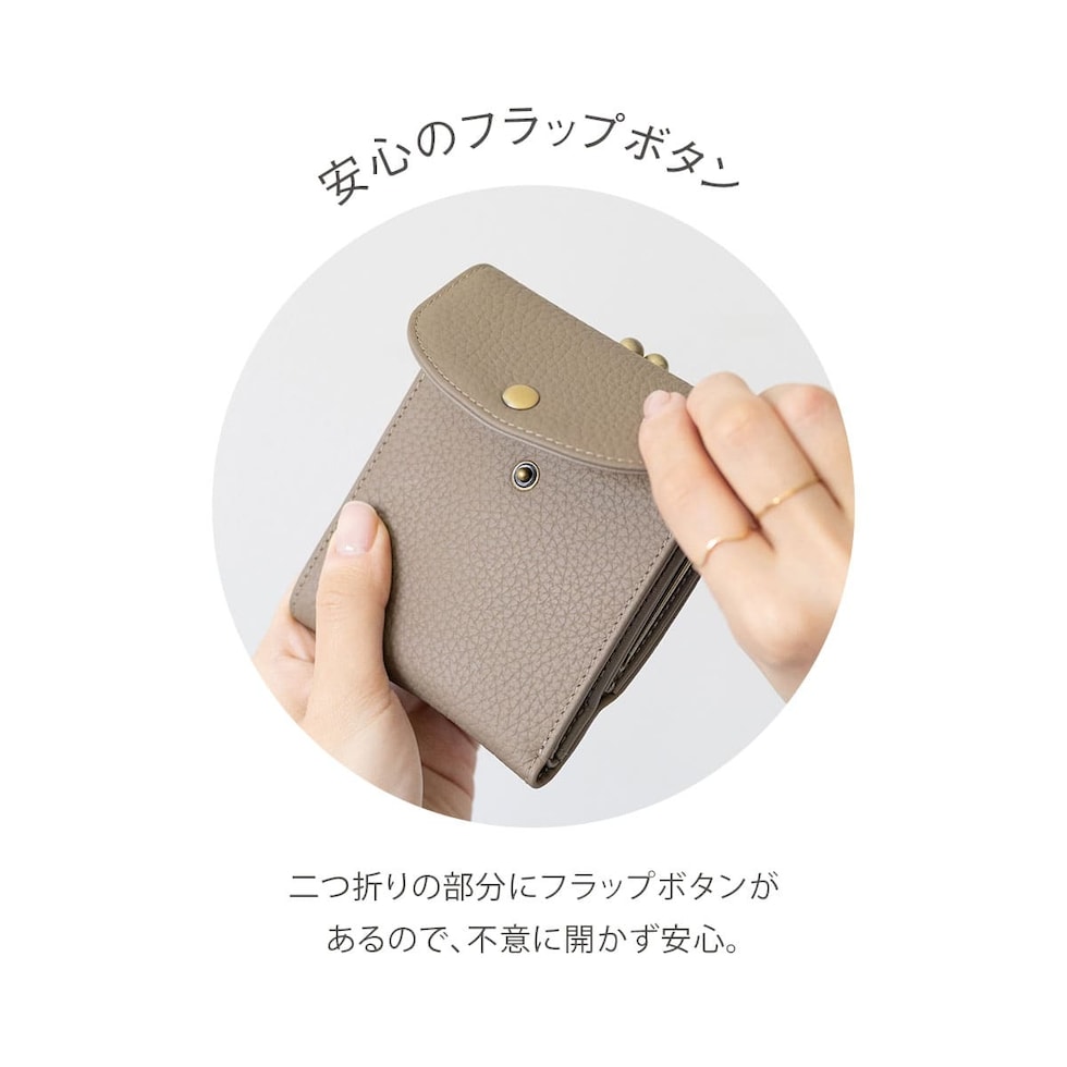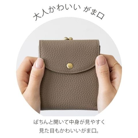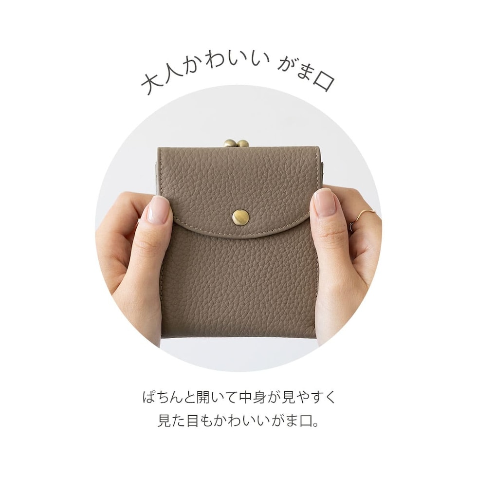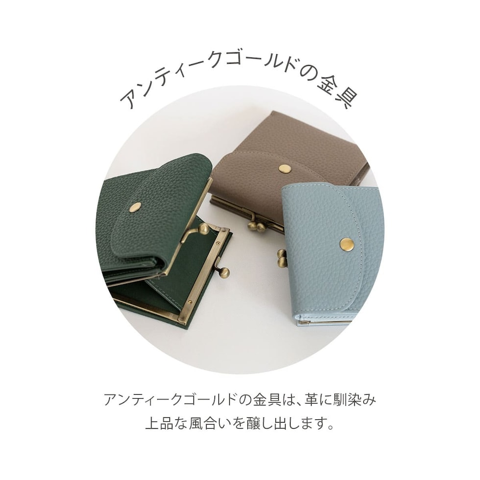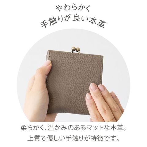 表地には柔らかなシュリンクレザーを使用しています。手に馴染む心地よい質感に、本革ならではの耐久性もポイント。レザーに合わせたアンティークカラーのがま口金具と、ラウンド型のフラップが上品な可愛らしさを演出します。