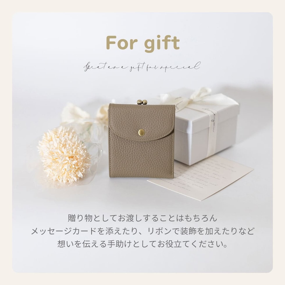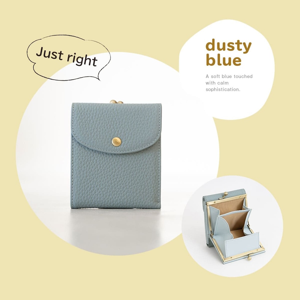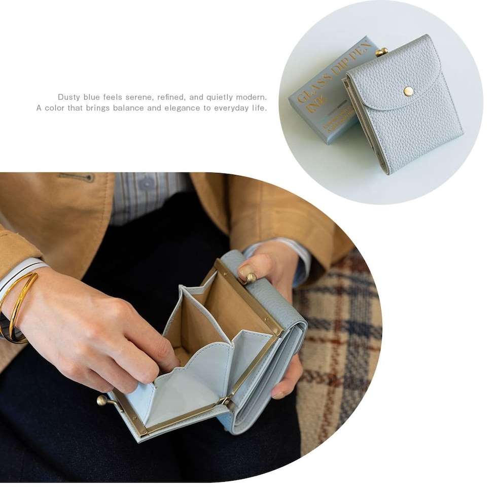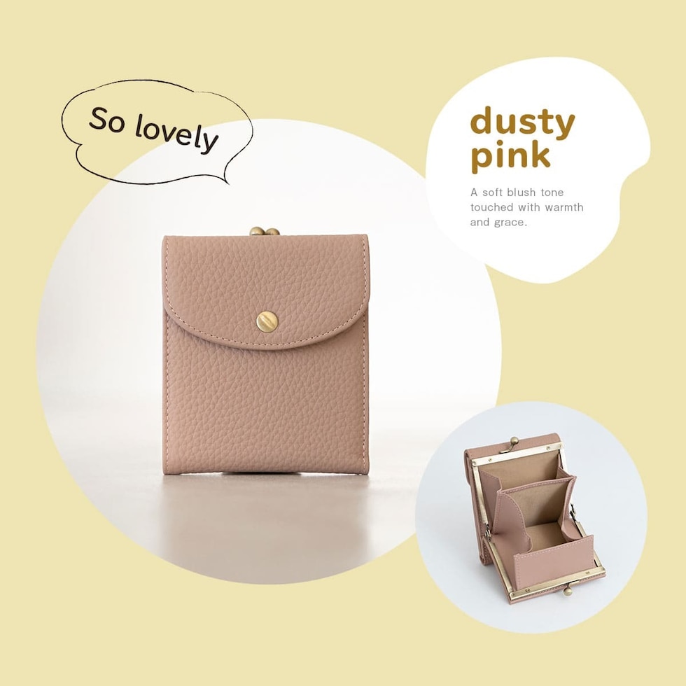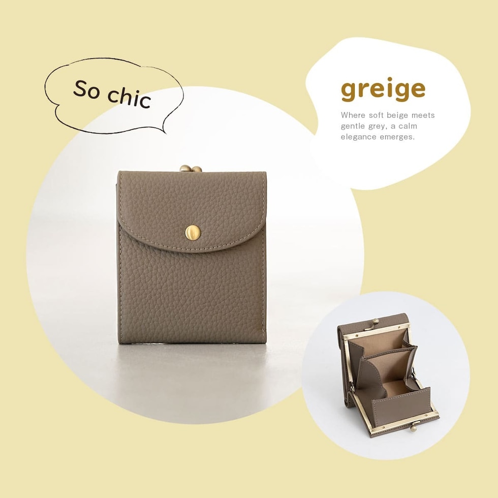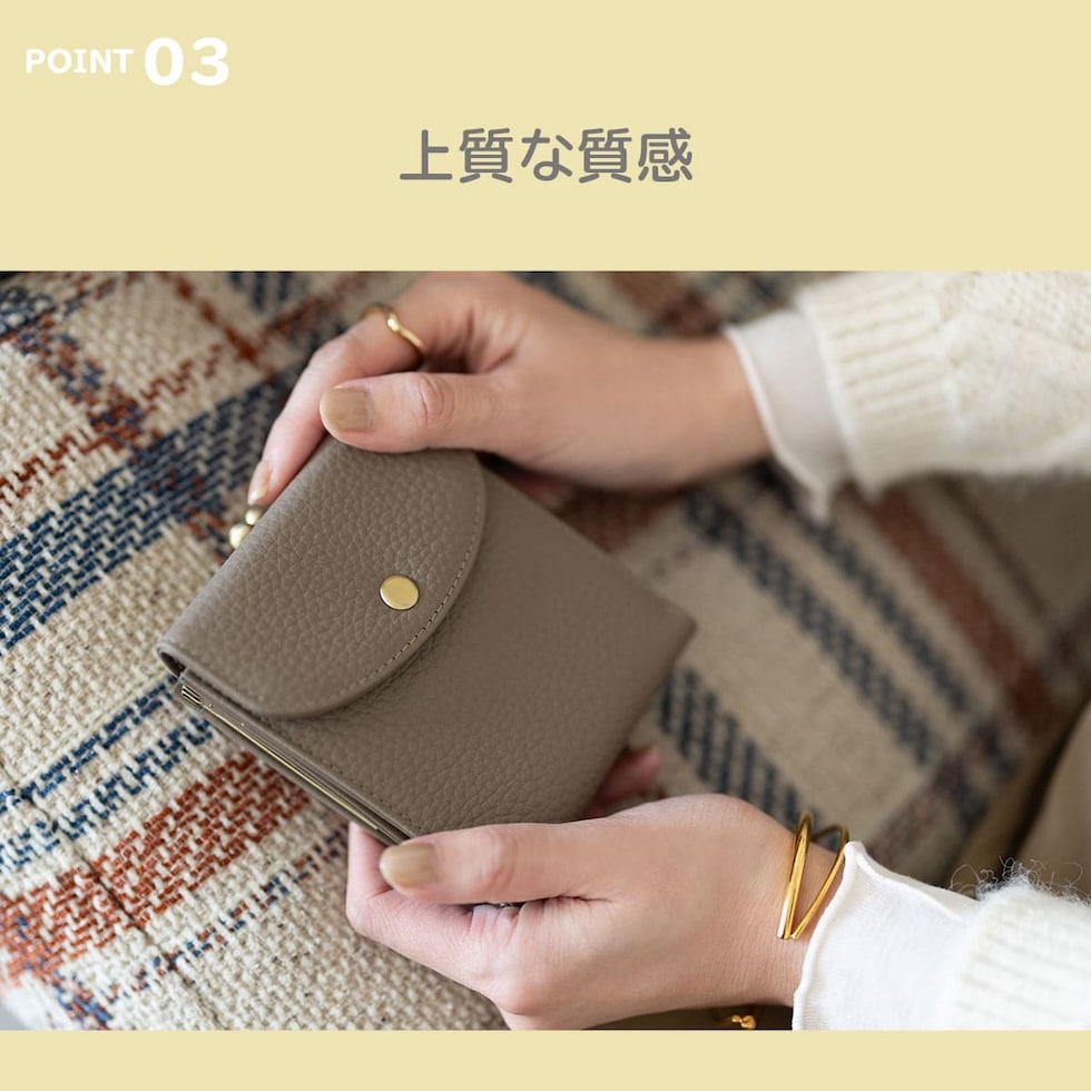 表地には柔らかなシュリンクレザーを使用しています。手に馴染む心地よい質感に、本革ならではの耐久性もポイント。レザーに合わせたアンティークカラーのがま口金具と、ラウンド型のフラップが上品な可愛らしさを演出します。
