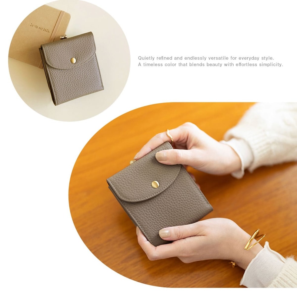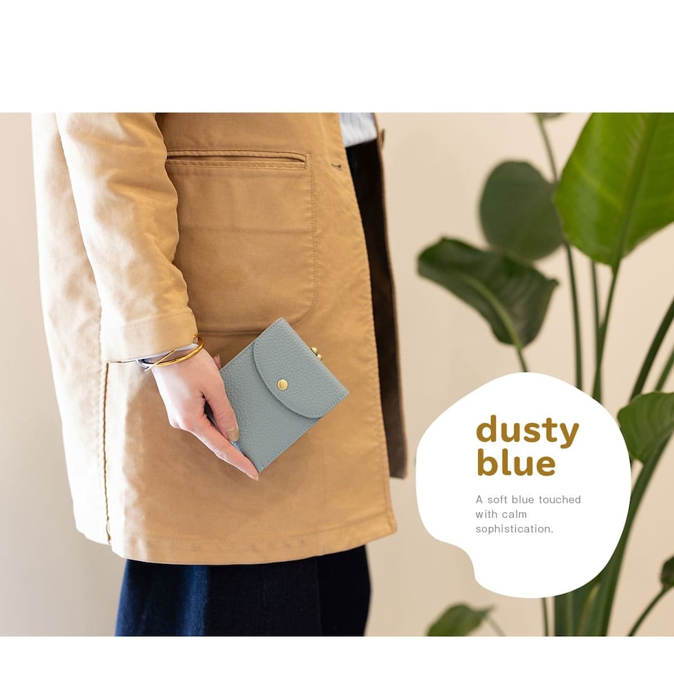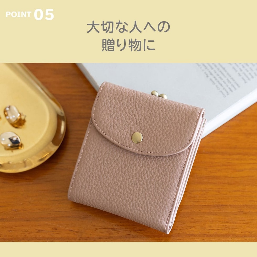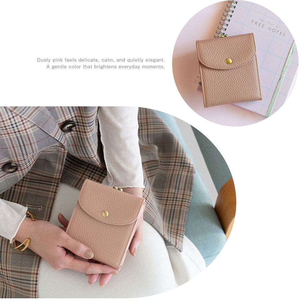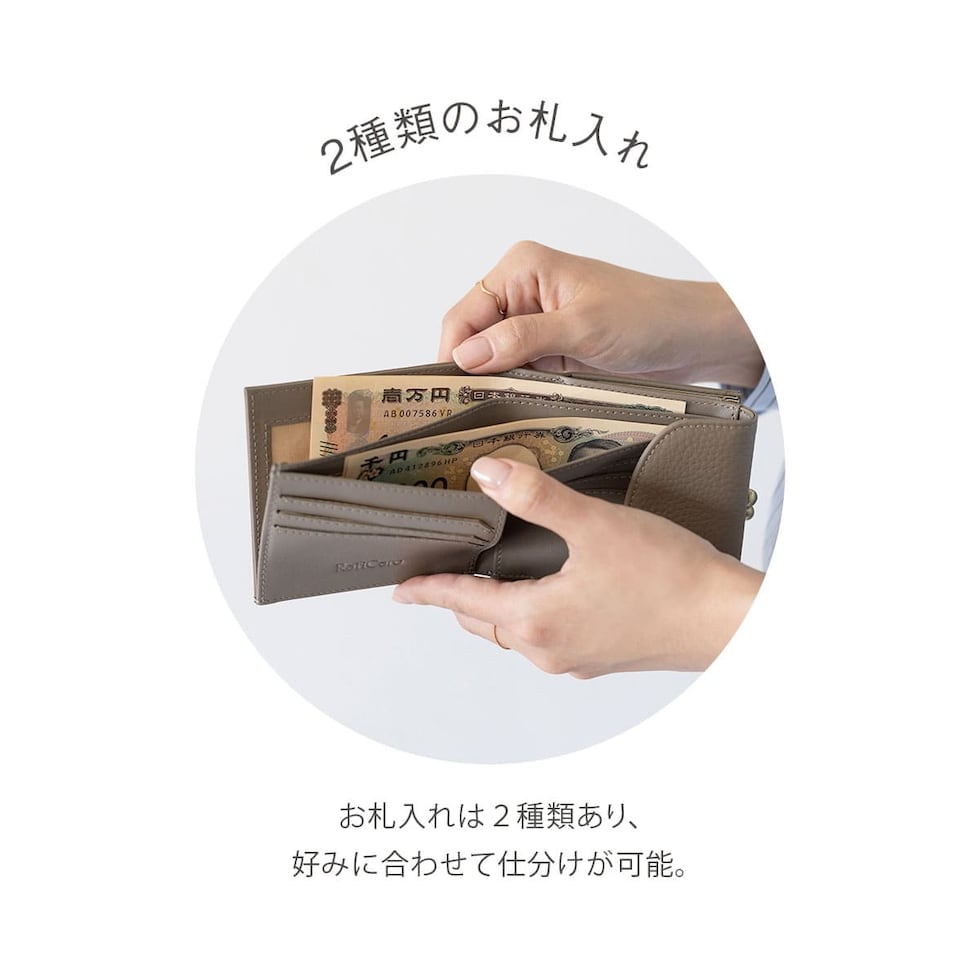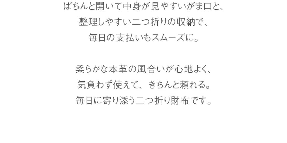 表地には柔らかなシュリンクレザーを使用しています。手に馴染む心地よい質感に、本革ならではの耐久性もポイント。レザーに合わせたアンティークカラーのがま口金具と、ラウンド型のフラップが上品な可愛らしさを演出します。