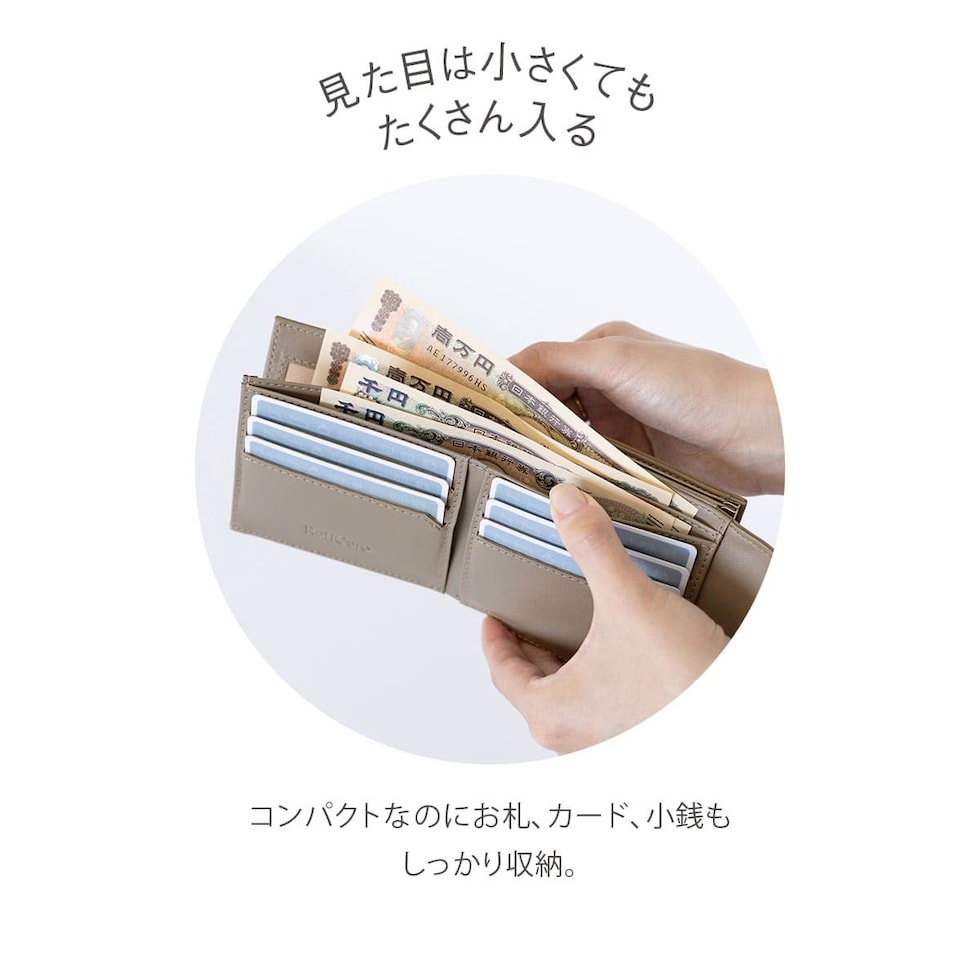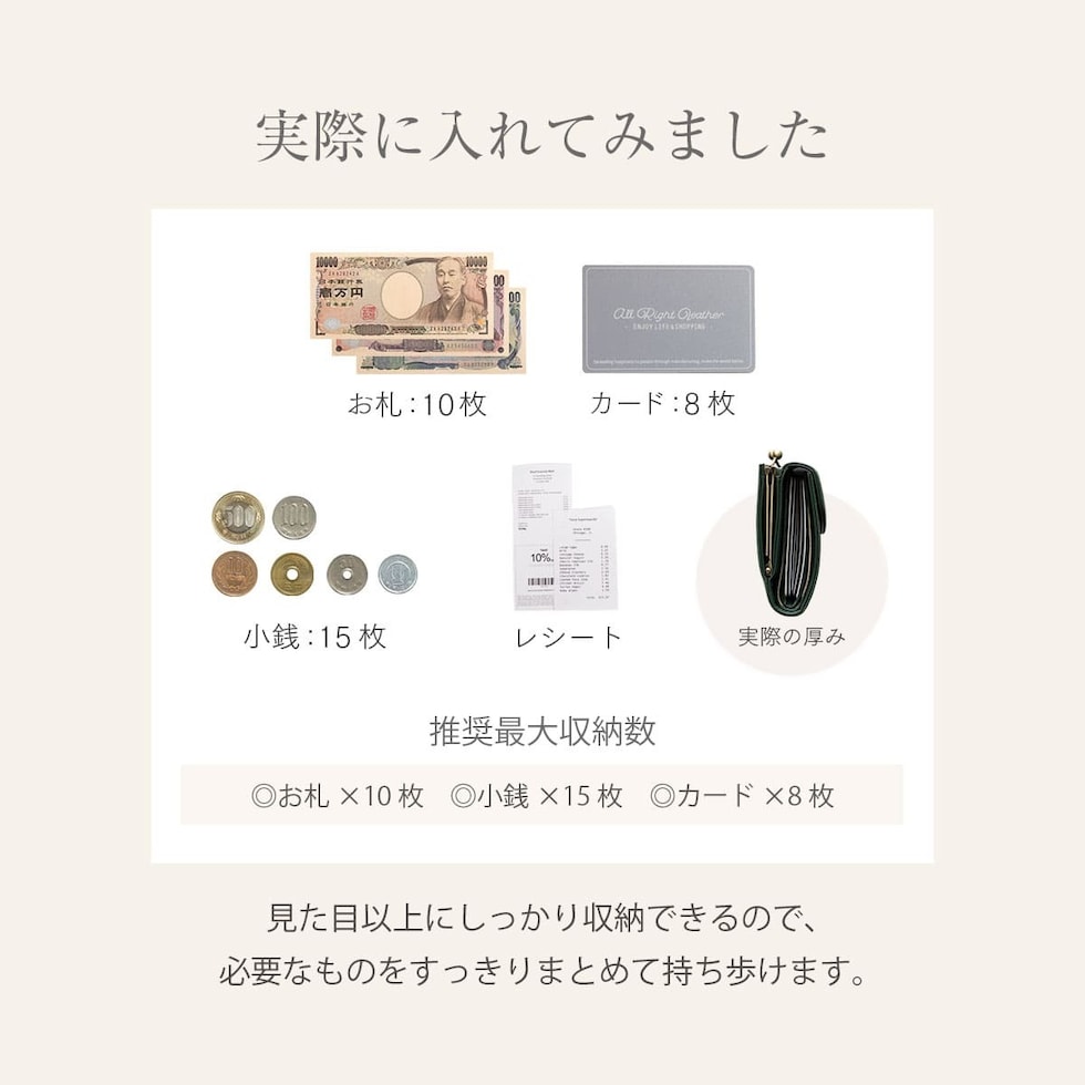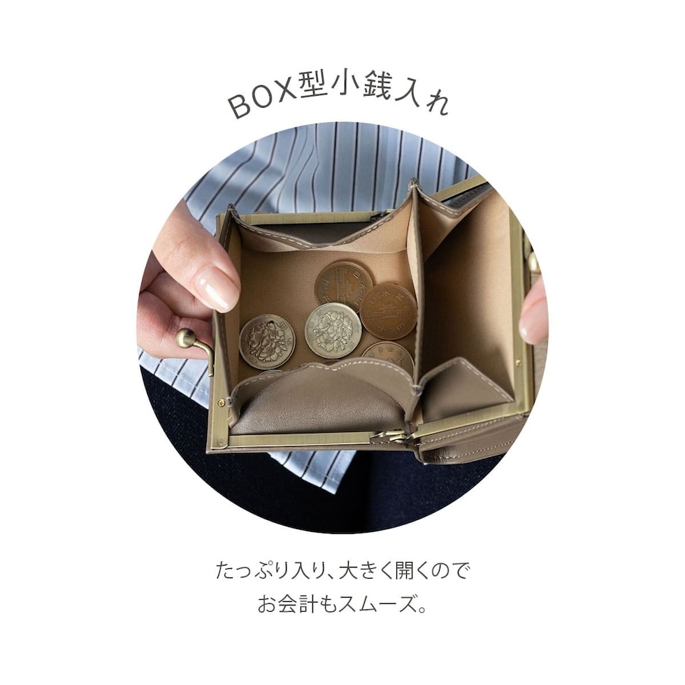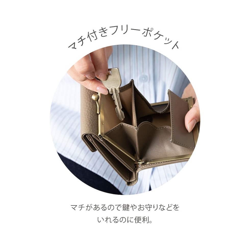 パチッと閉まる使い心地が魅力のがま口財布です。がま口を開いた内側はボックス型の小銭入れ。鍵などの小物収納に便利なマチポケット付き。フラップ側には6つのカードポケットとお札入れ、フリーポケットも付いて仕分けがラクラクです。