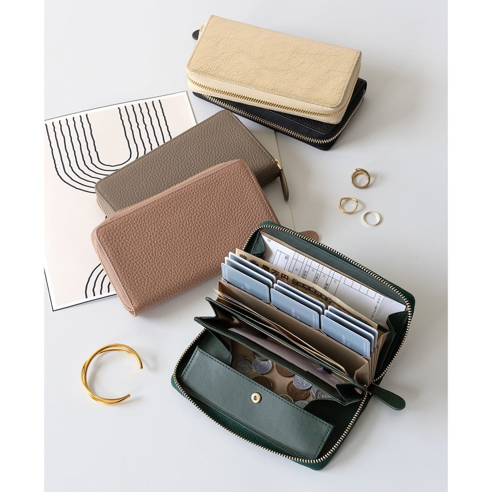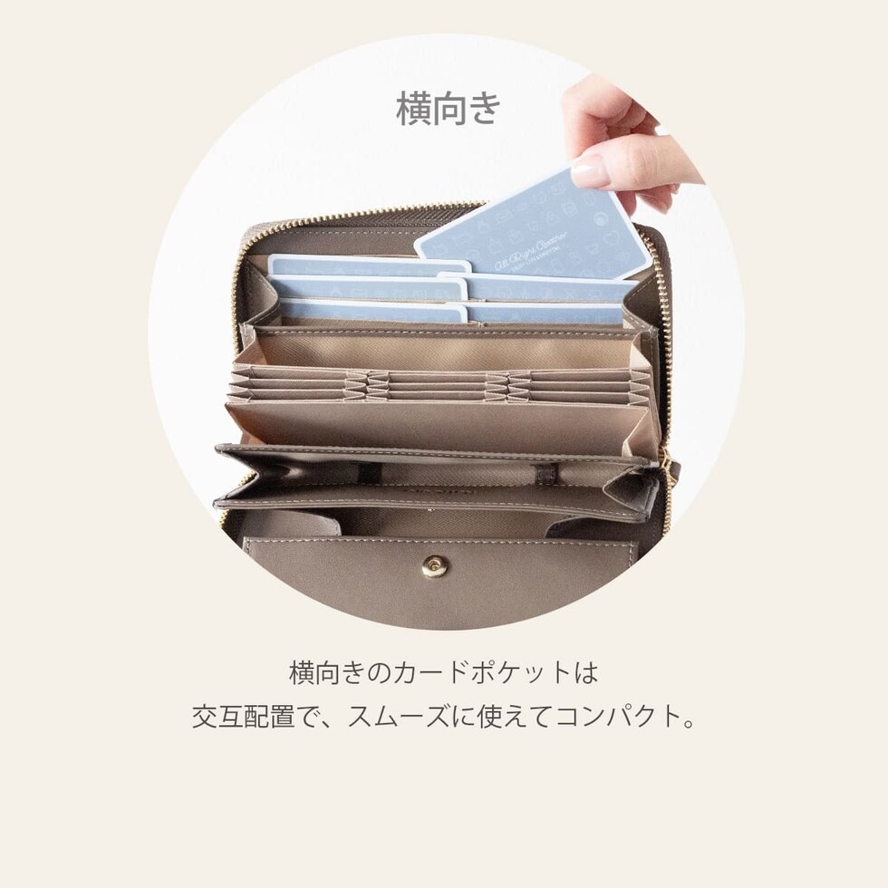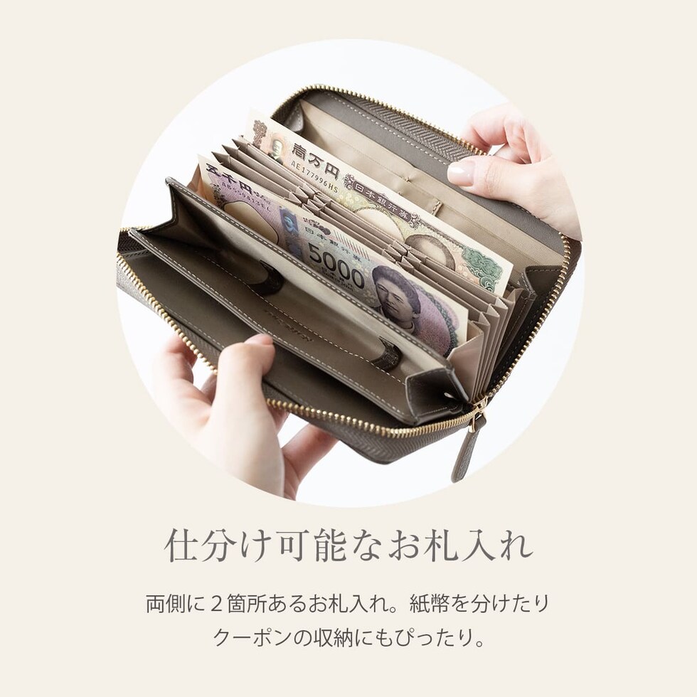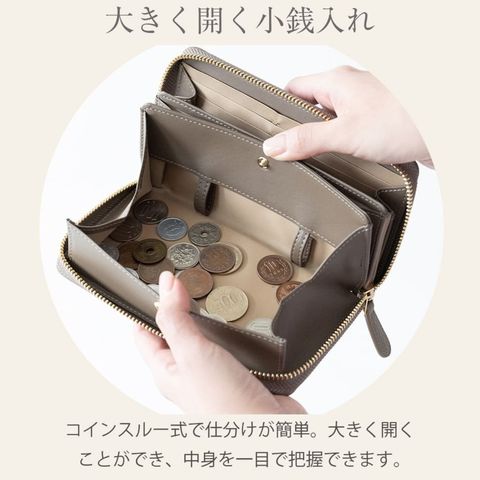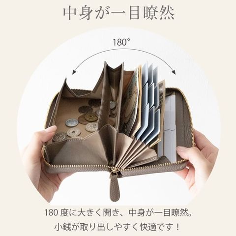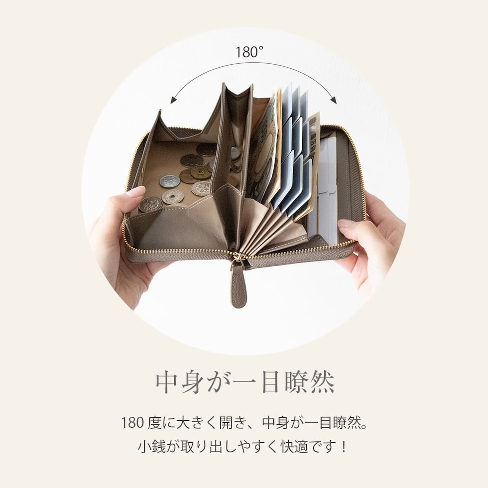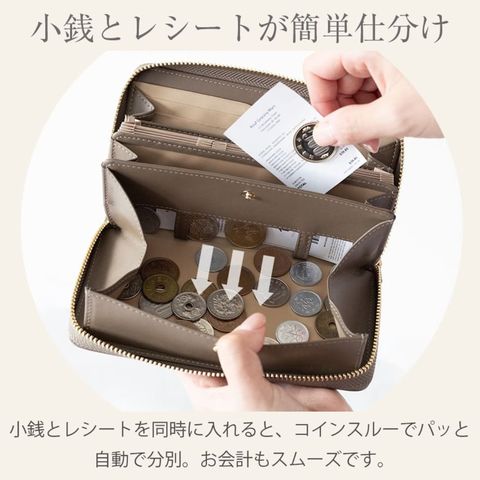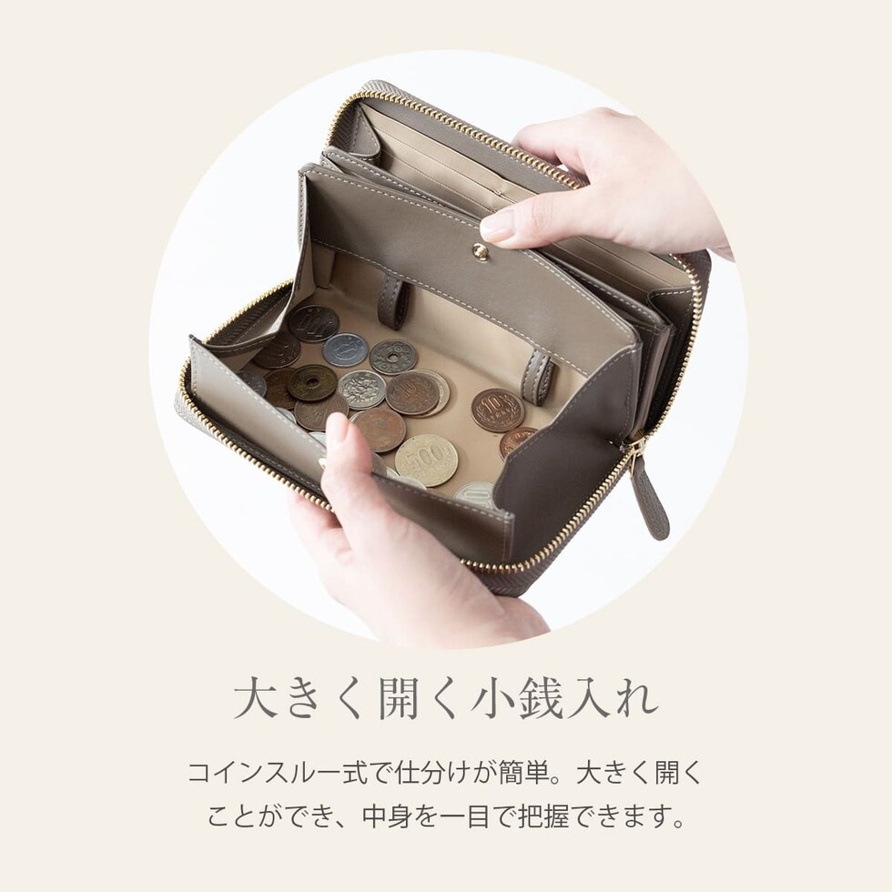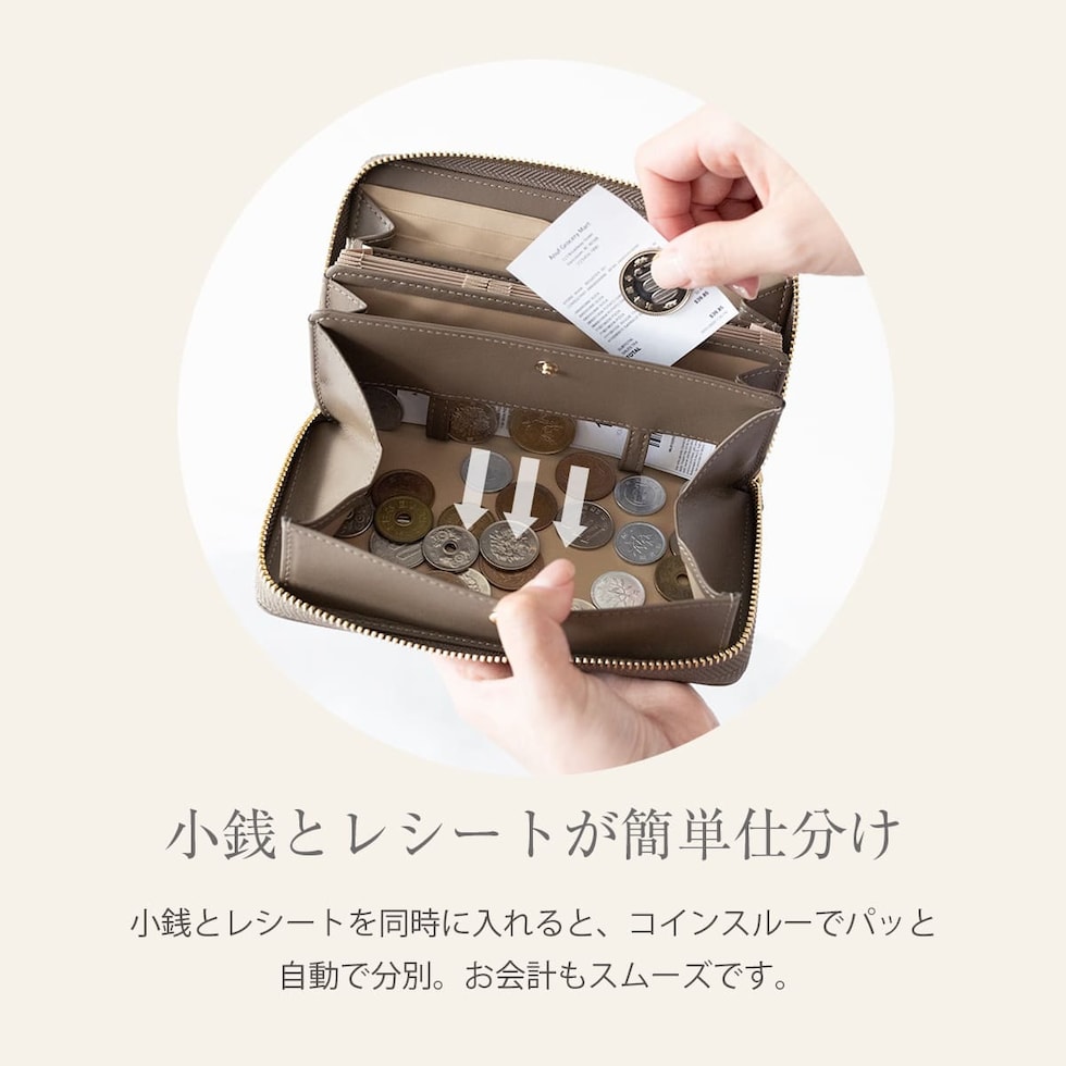 大きく開いて全体が見渡しやすいラウンドファスナー。多収納カードポケットで仕分けもばっちり。人気のボックス型小銭入れは、レシートを自動で振り分けるギミック付きで、お会計もスマートに。