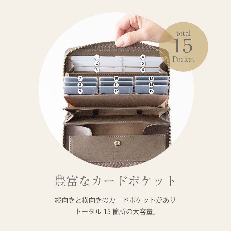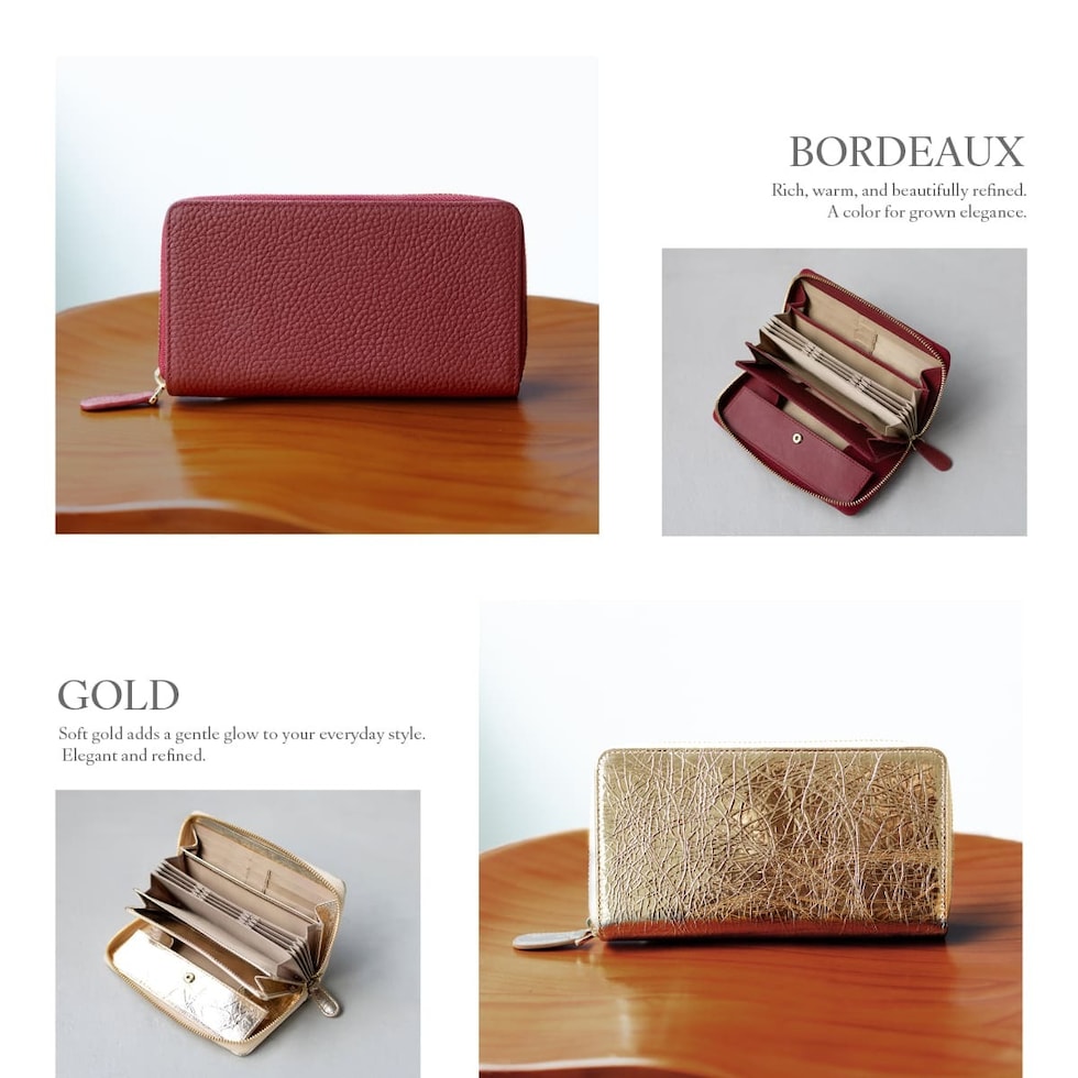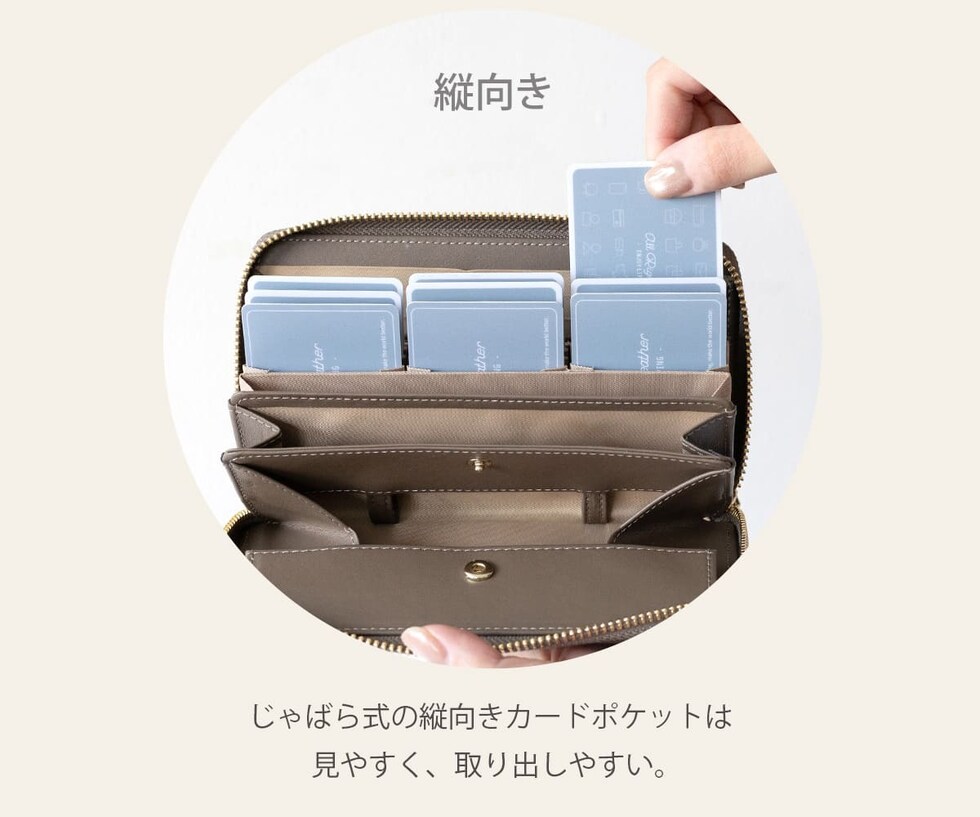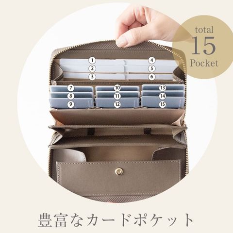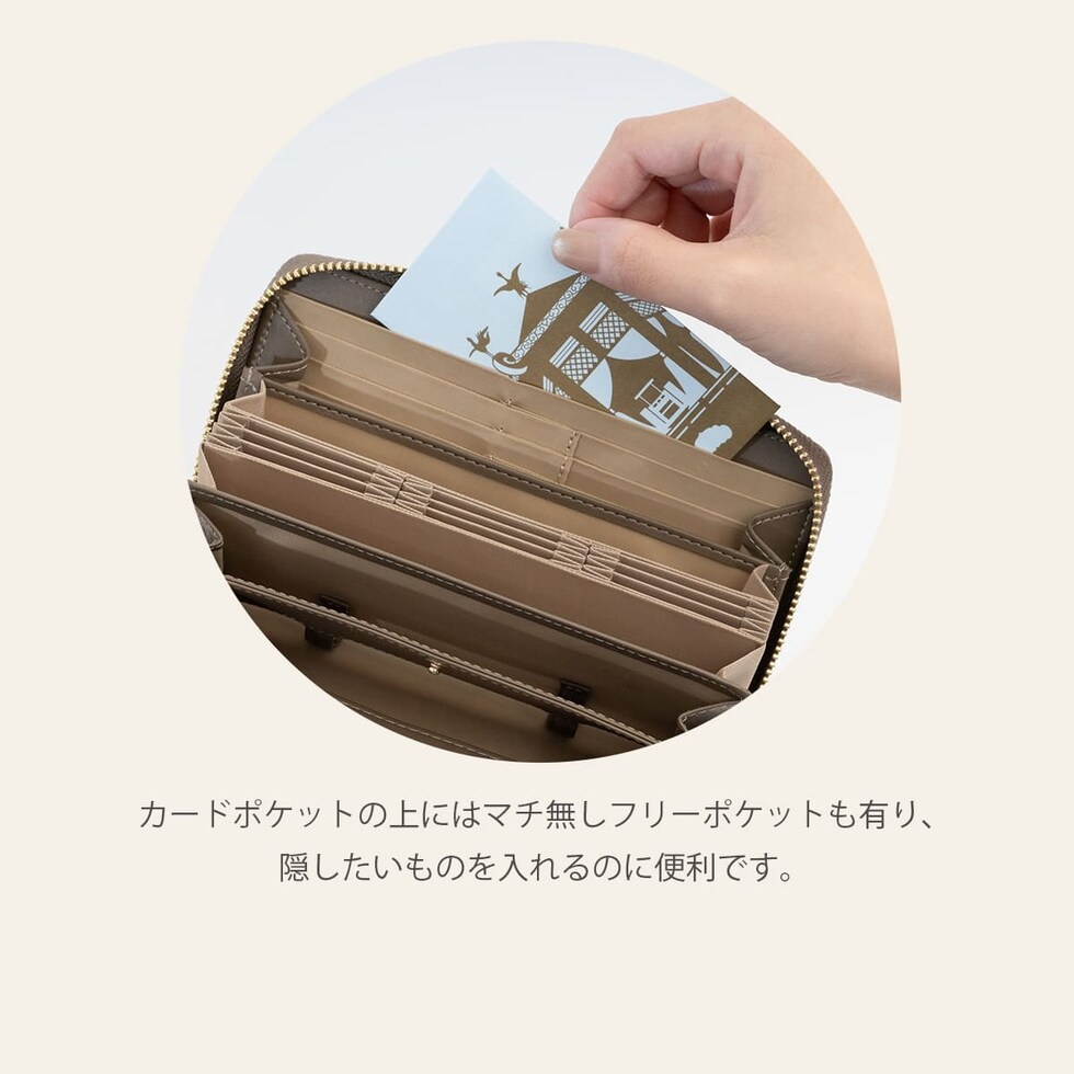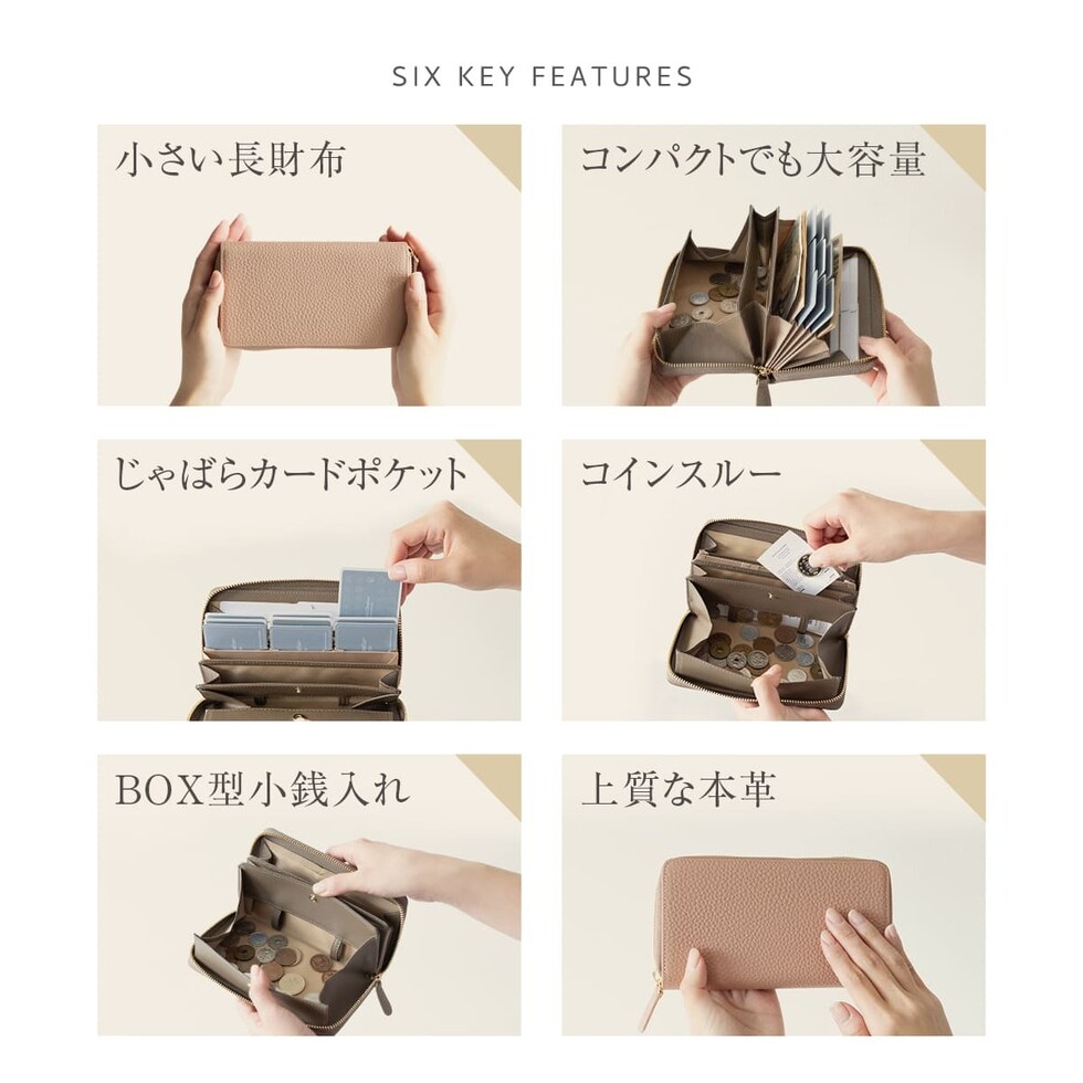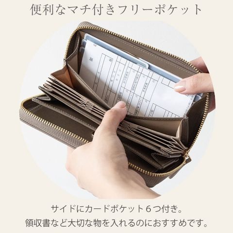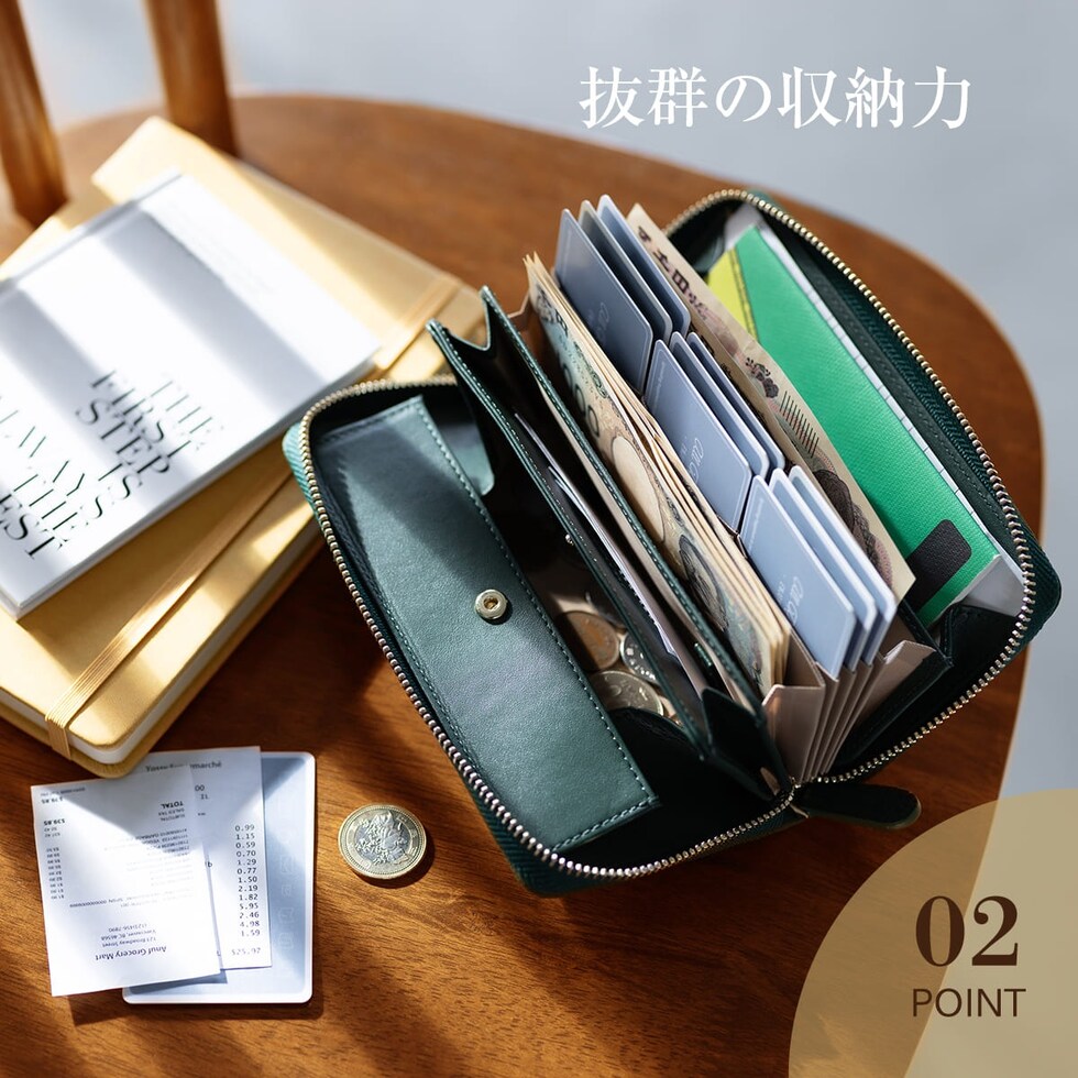 大きく開いて全体が見渡しやすいラウンドファスナー。多収納カードポケットで仕分けもばっちり。人気のボックス型小銭入れは、レシートを自動で振り分けるギミック付きで、お会計もスマートに。