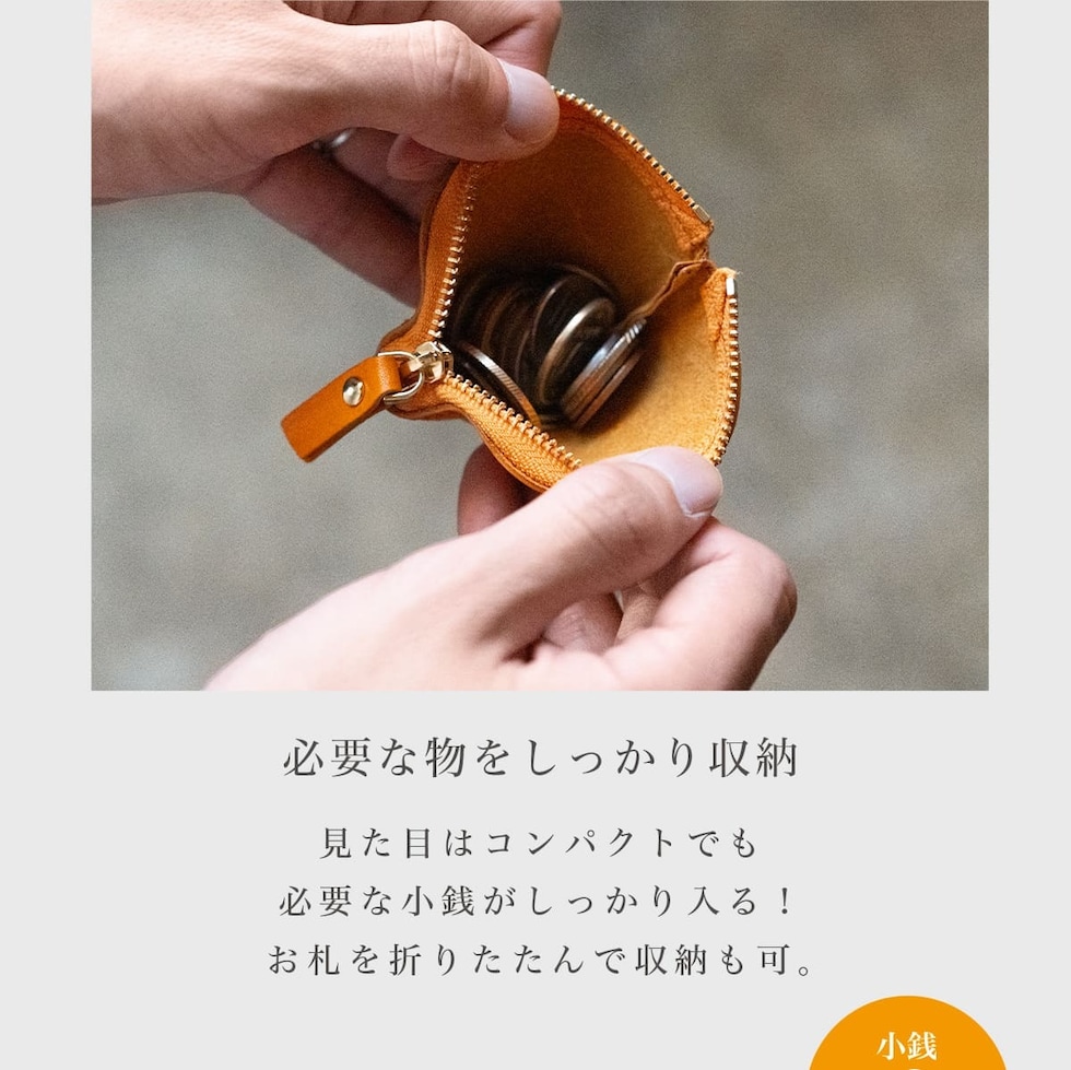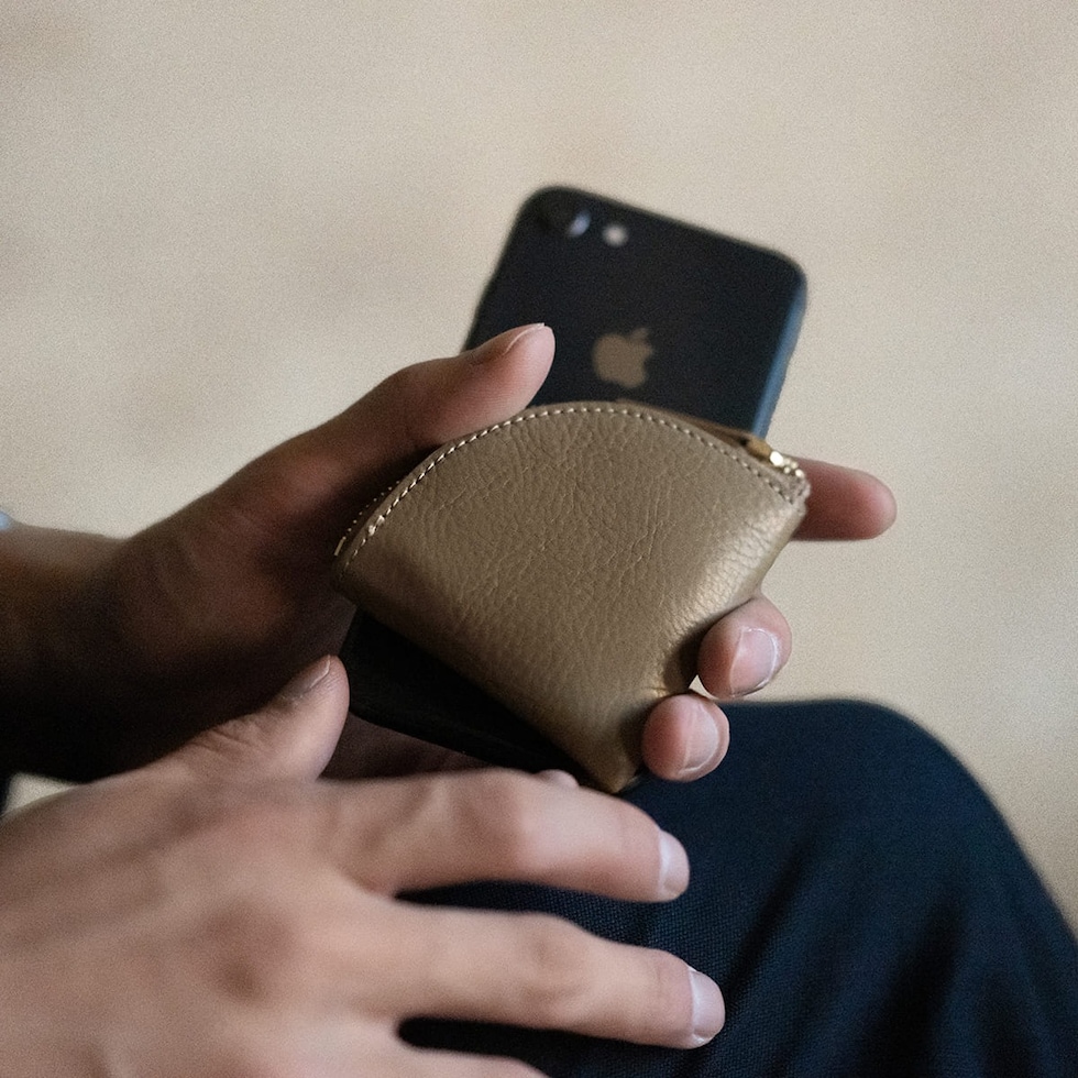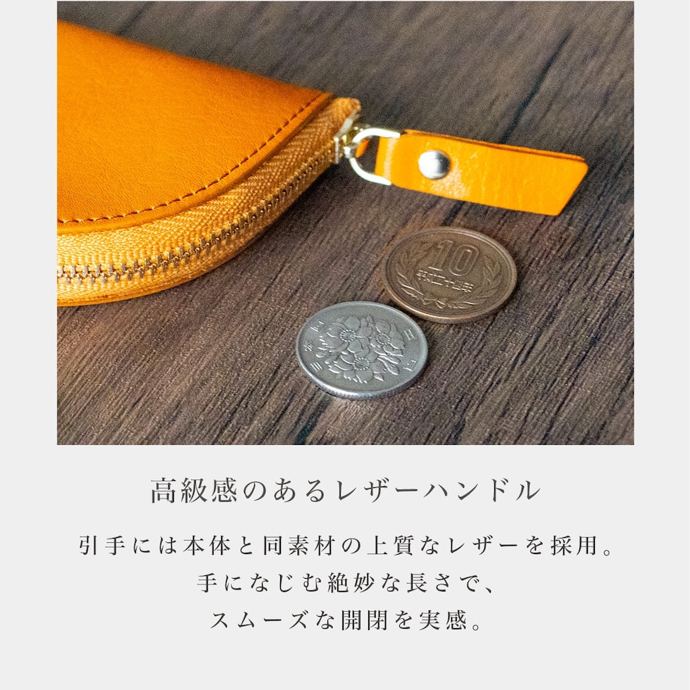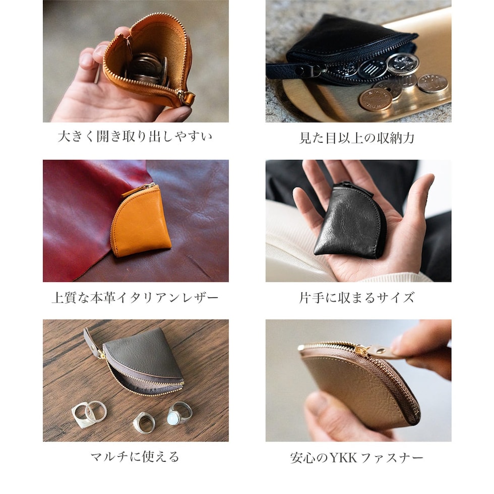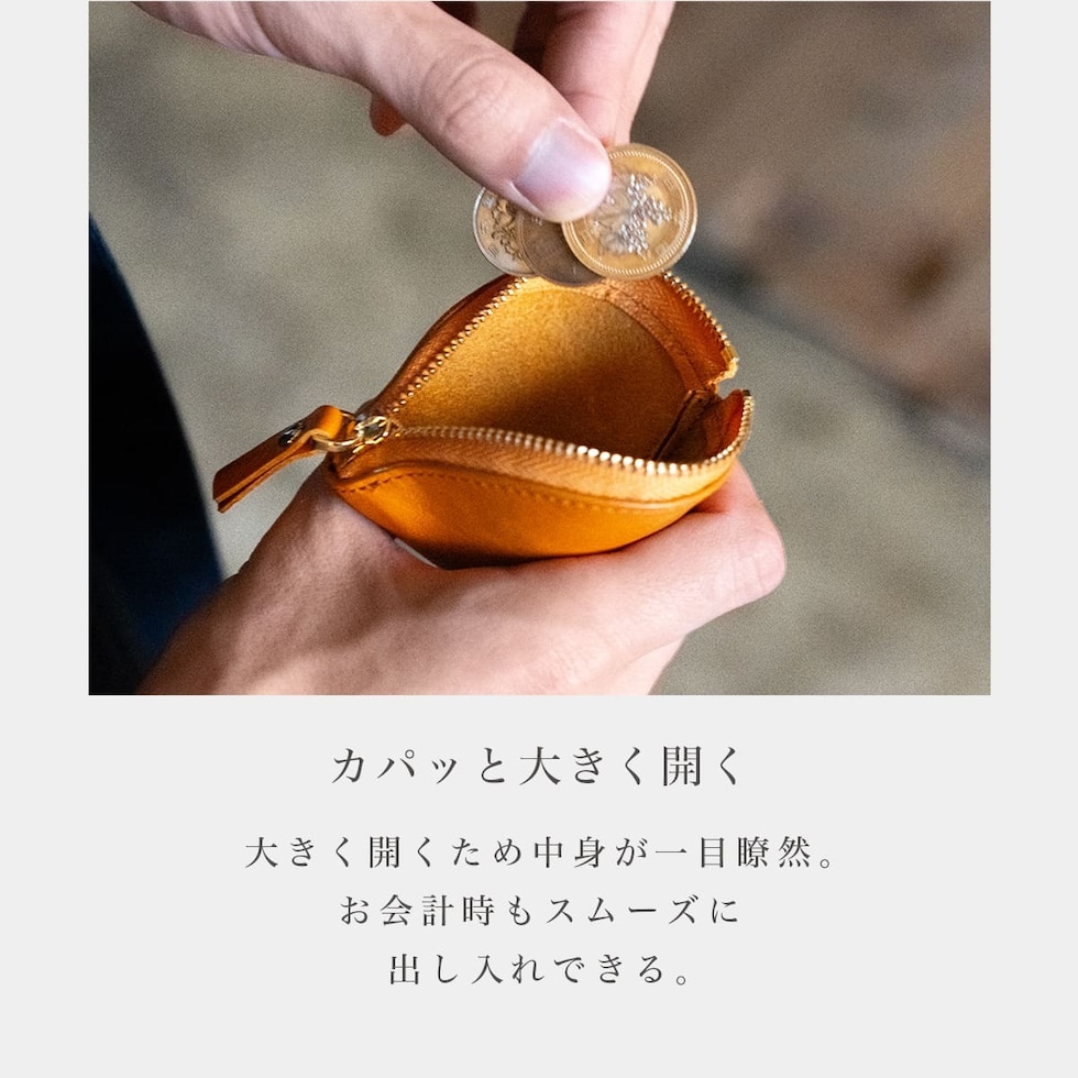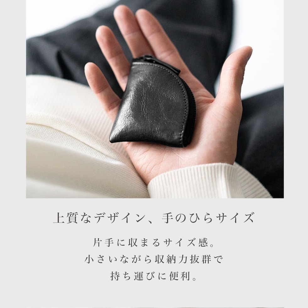 手のひらサイズで気兼ねなく持ち歩きできるコインケースです。小銭なら50枚入る大容量。扇型デザインとL字ファスナーで大きく開き、出し入れもスムーズ。ガジェットポーチやピルケースとしてもお使いいただけます。