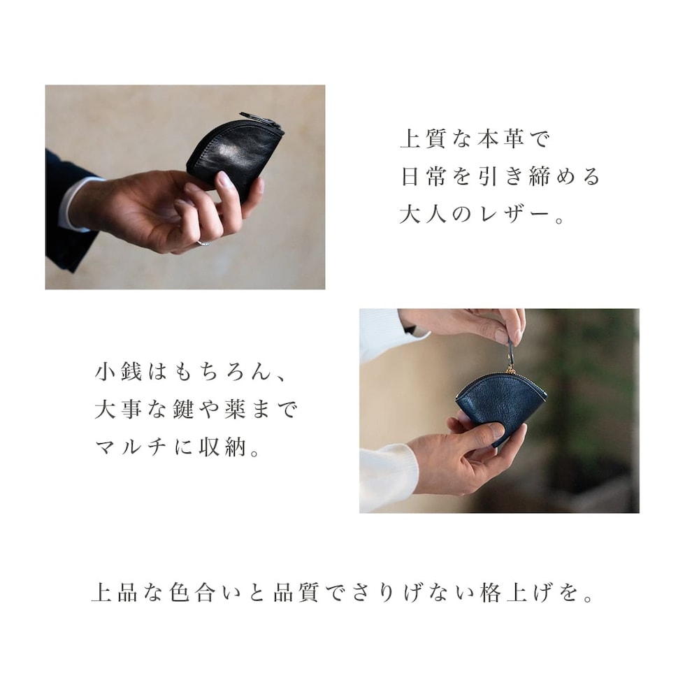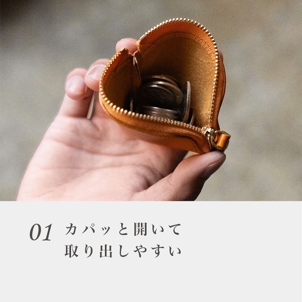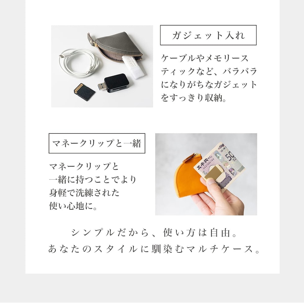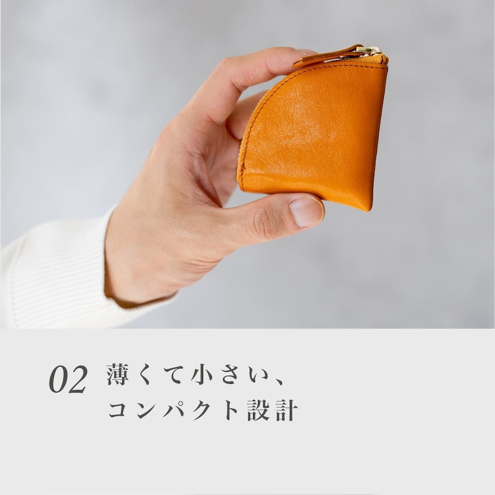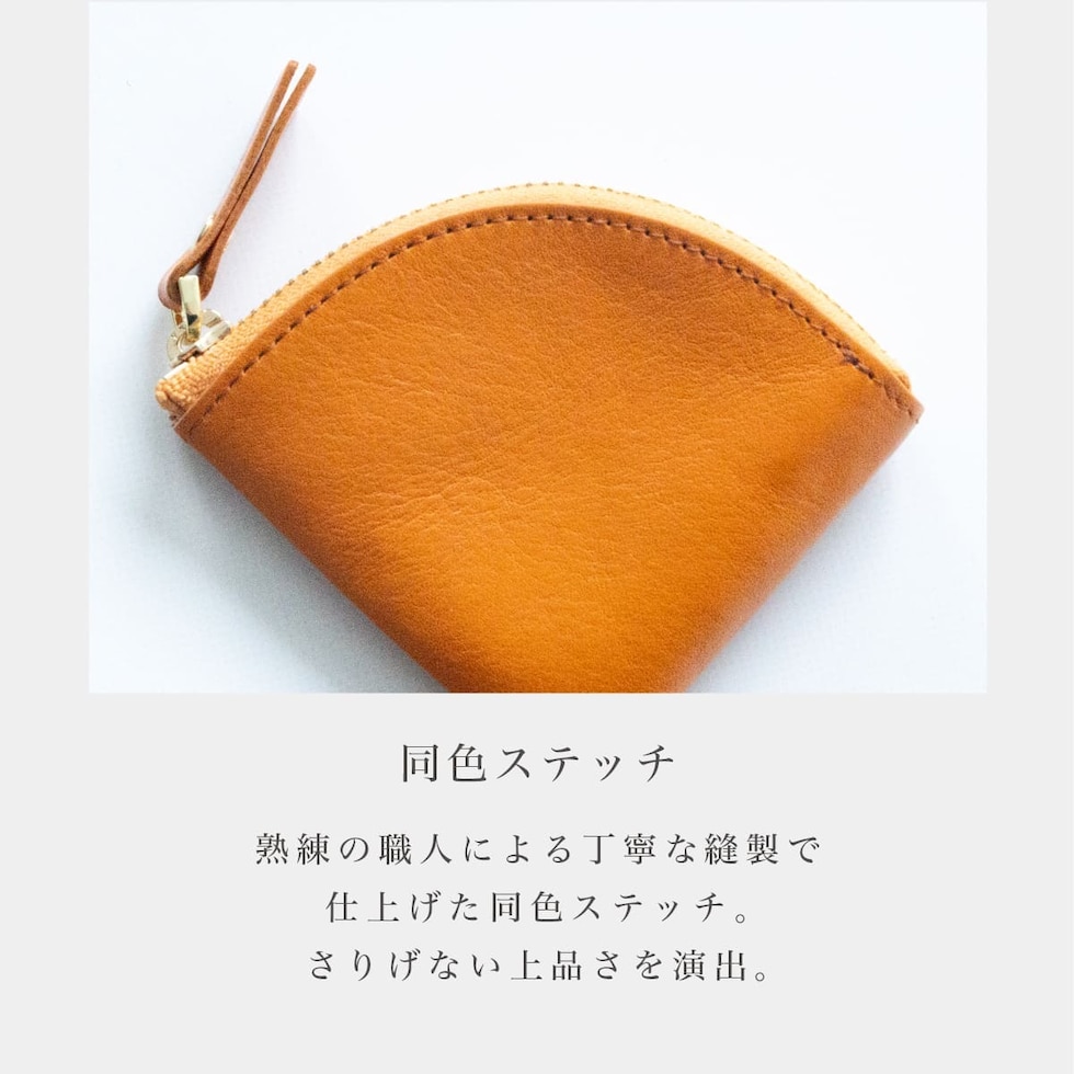 手のひらサイズで気兼ねなく持ち歩きできるコインケースです。小銭なら50枚入る大容量。扇型デザインとL字ファスナーで大きく開き、出し入れもスムーズ。ガジェットポーチやピルケースとしてもお使いいただけます。