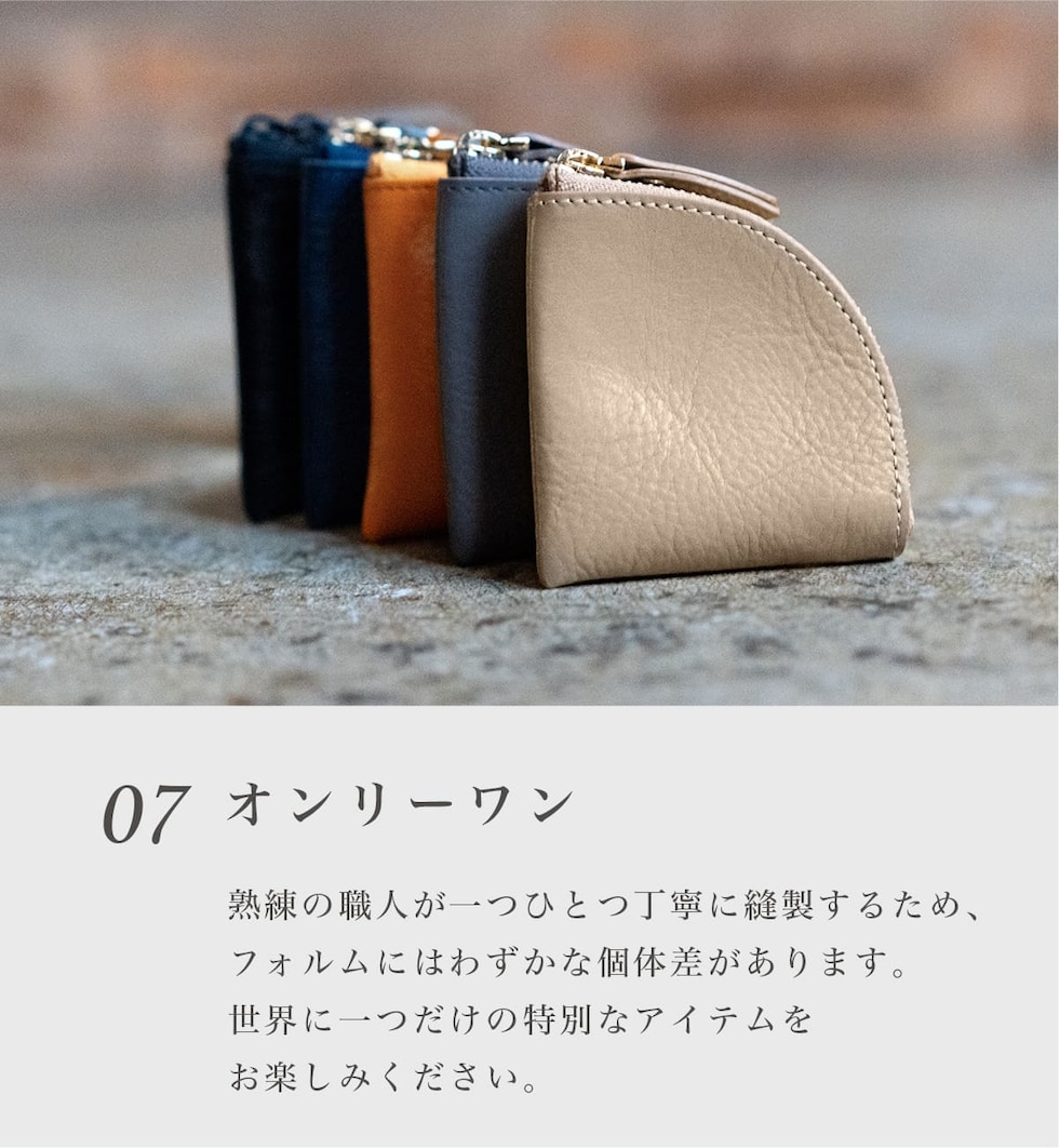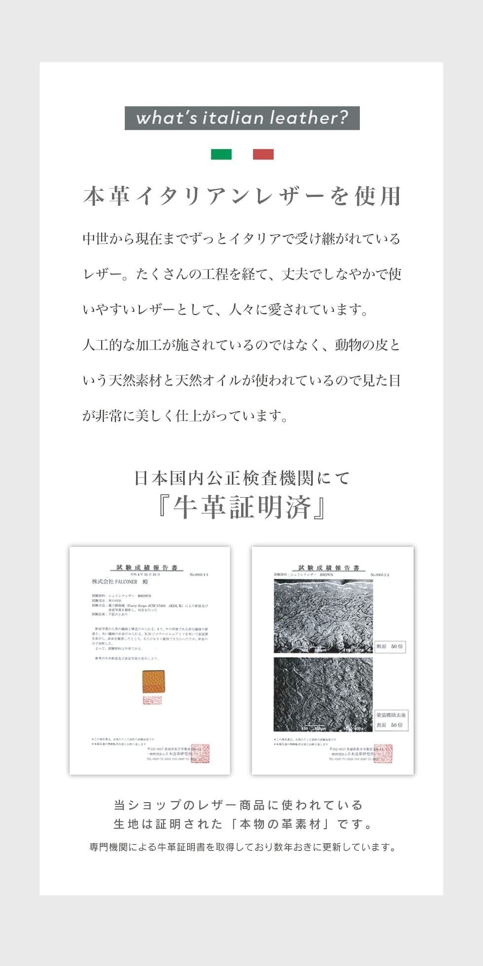 イタリアの伝統的な製法で仕上げられた本革を使用しました。上質な手触りと、使うほどに艶と色味が深まるエイジングをお楽しみください。ファスナーは滑らかで耐久性に優れたYKK製です。