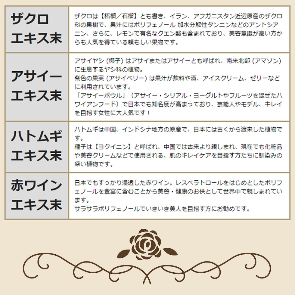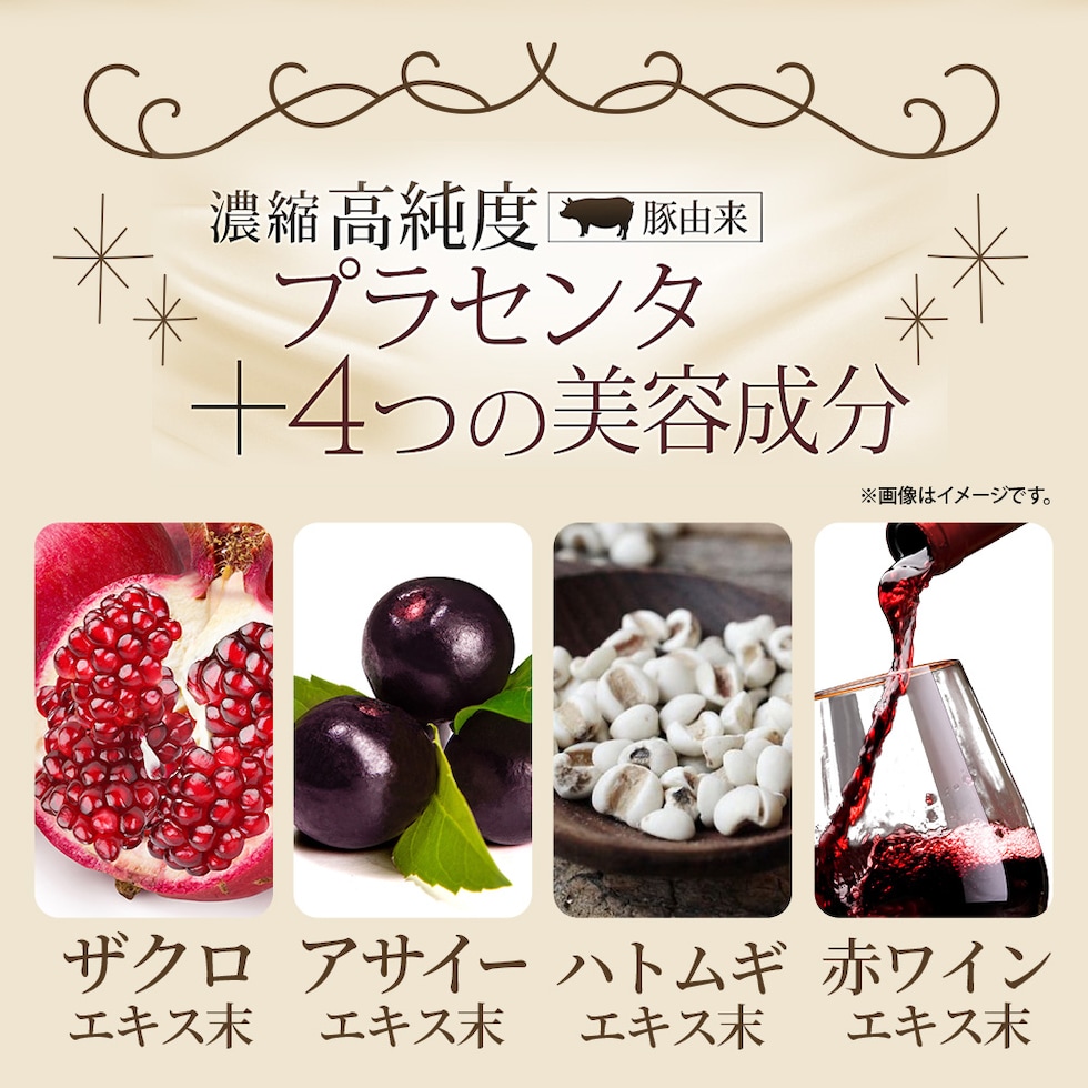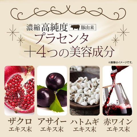 豚プラセンタエキス末(豚肉を含む)(イタリア製造)、マルトデキストリン、還元麦芽糖水飴、ザクロエキス末(デキストリン、ザクロ果汁)、アサイーエキス末(デキストリン、アサイーエキス、アカシア食物繊維)、ハトムギエキス末、レスベラトロール含有赤ワインエキス末/セルロース、ステアリン酸カルシウム、微粒酸化ケイ素