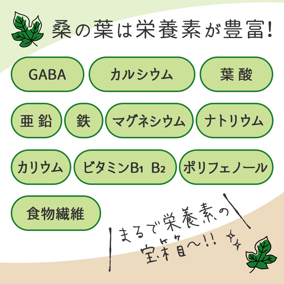 クワ末(国内製造)、桑葉エキス末/セルロース、ショ糖脂肪酸エステル、微粒酸化ケイ素
