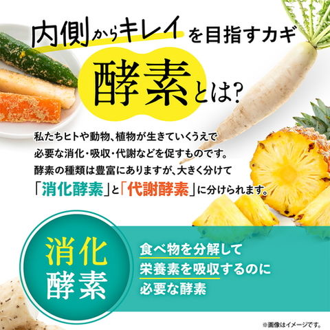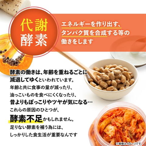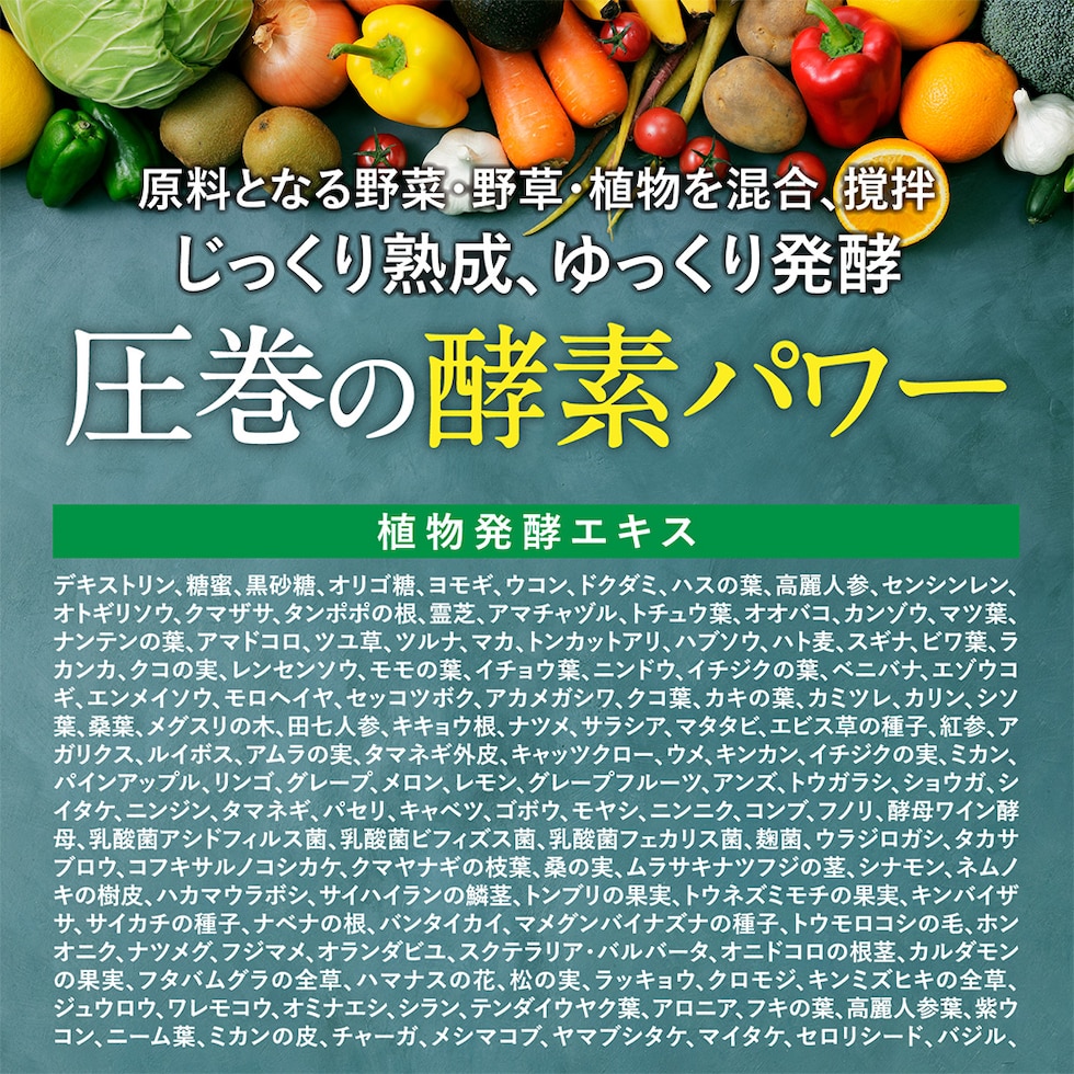 難消化性デキストリン(国内製造)、植物発酵物乾燥粉末(デキストリン、植物発酵物乾燥末)、植物発酵エキス(デキストリン、糖蜜、黒砂糖、オリゴ糖、その他)/結晶セルロース、ショ糖脂肪酸エステル、微粒二酸化ケイ素、(一部に卵・大豆・バナナ・やまいも・りんご・キウイフルーツ・オレンジ・ゴマ・カシューナッツを含む)