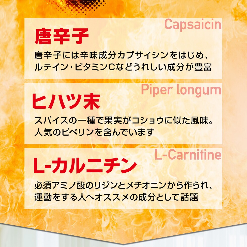 難消化性デキストリン(国内製造)、デキストリン、コレウスフォルスコリエキス末、ヒハツ、唐辛子、L-カルニチンフマル酸塩/結晶セルロース、ショ糖脂肪酸エステル、微粒酸化ケイ素、香辛料