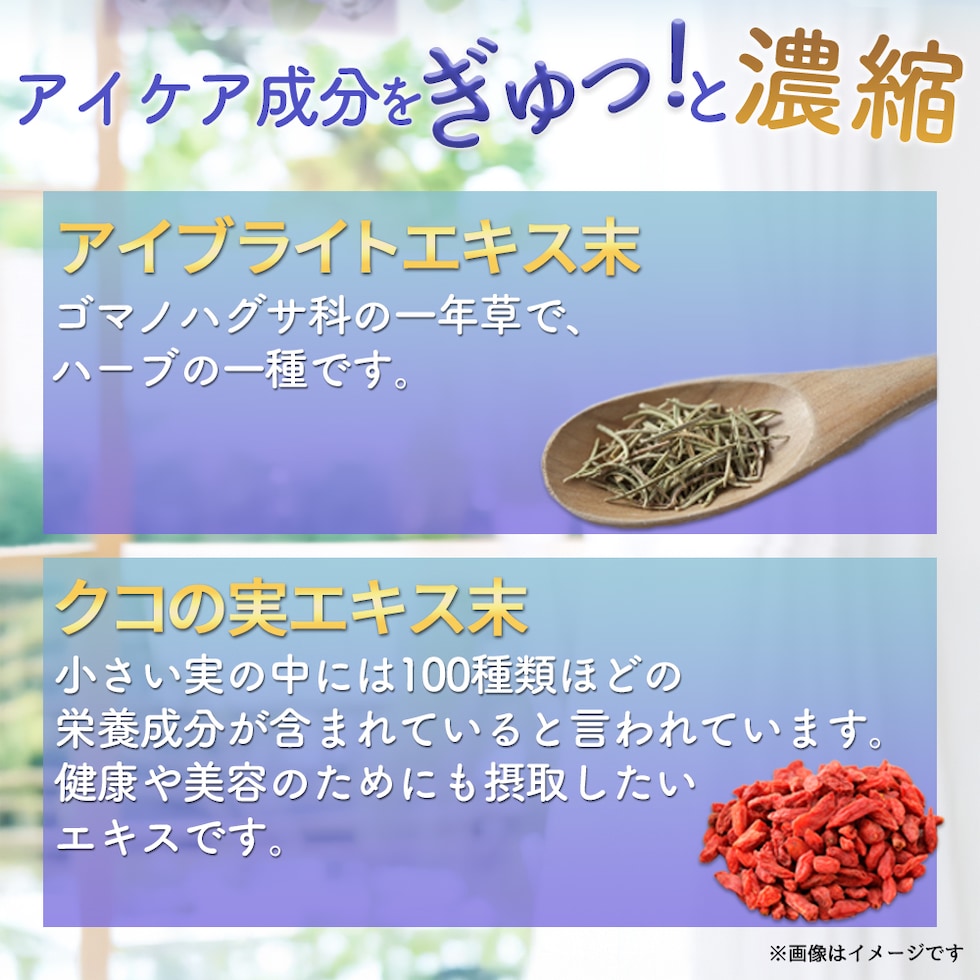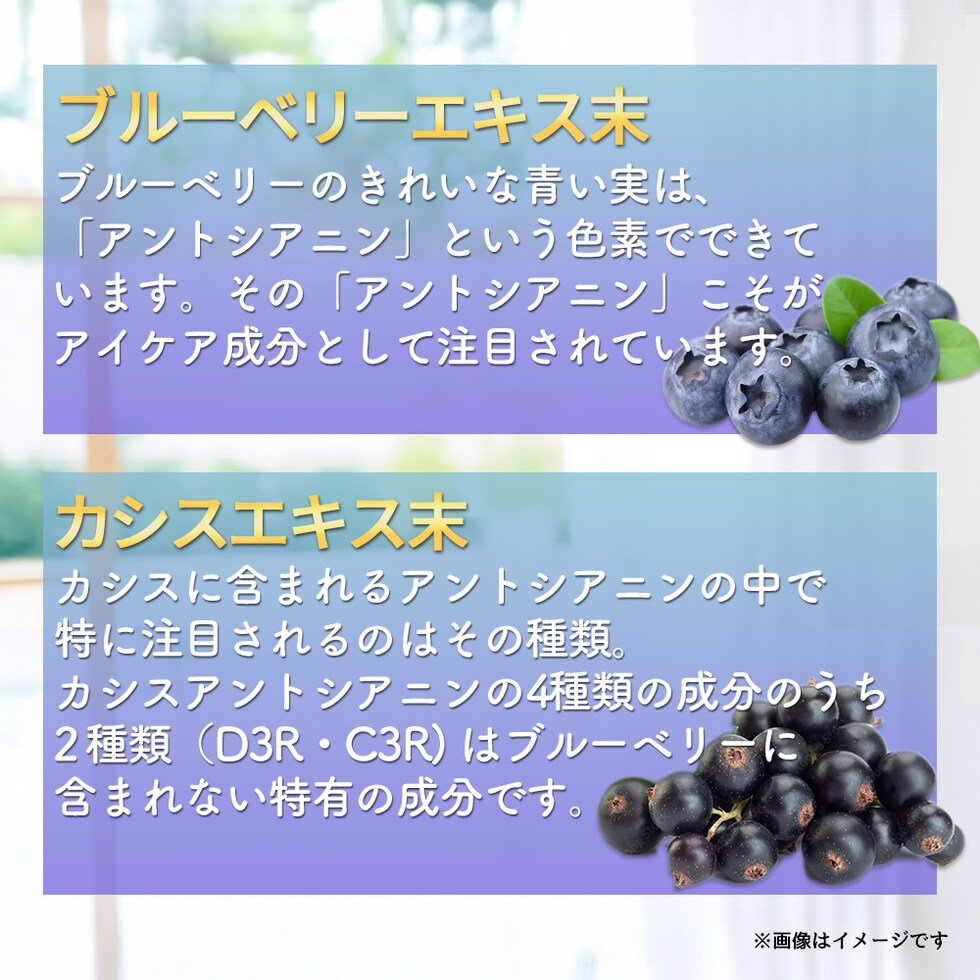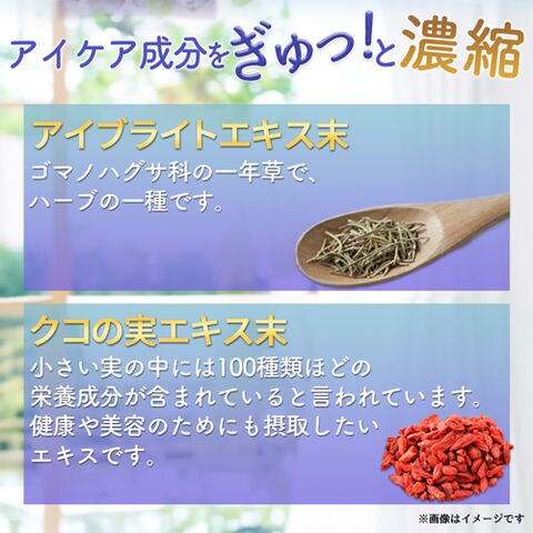 還元麦芽糖水飴(国内製造)、デキストリン、ブルーベリー濃縮果汁末(デキストリン、ブルーベリー濃縮果汁)、ビルベリーエキス末、アイブライト乾燥エキス末(アイブライトエキス、マルトデキストリン)、カシスエキス末、クコ末/セルロース、ステアリン酸カルシウム、微粒酸化ケイ素、ビタミンB1、ビタミンB6、ビタミンB12