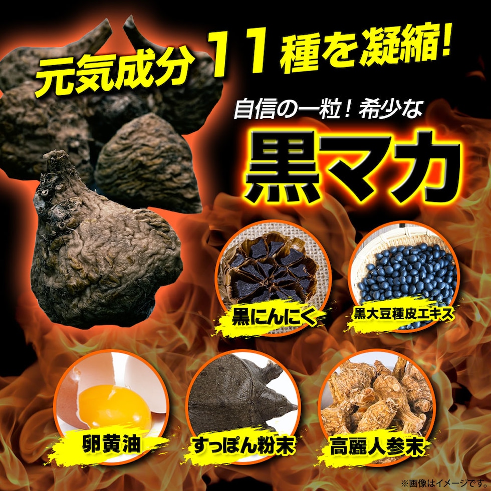 食用サフラワー油(国内製造)、醗酵黒ニンニク末、卵黄油、黒マカエキス末(黒マカエキス、デキストリン)、高麗人参末、スッポン末、黒大豆種皮エキス末、黒酢もろみ末、牡蠣エキス末(牡蠣エキス、デキストリン)、紅景天エキス末/ゼラチン、グリセリン、グリセリン脂肪酸エステル、ミツロウ