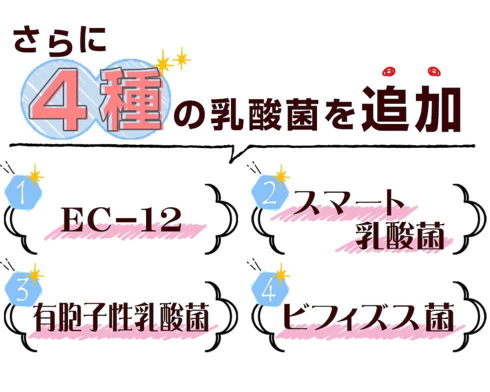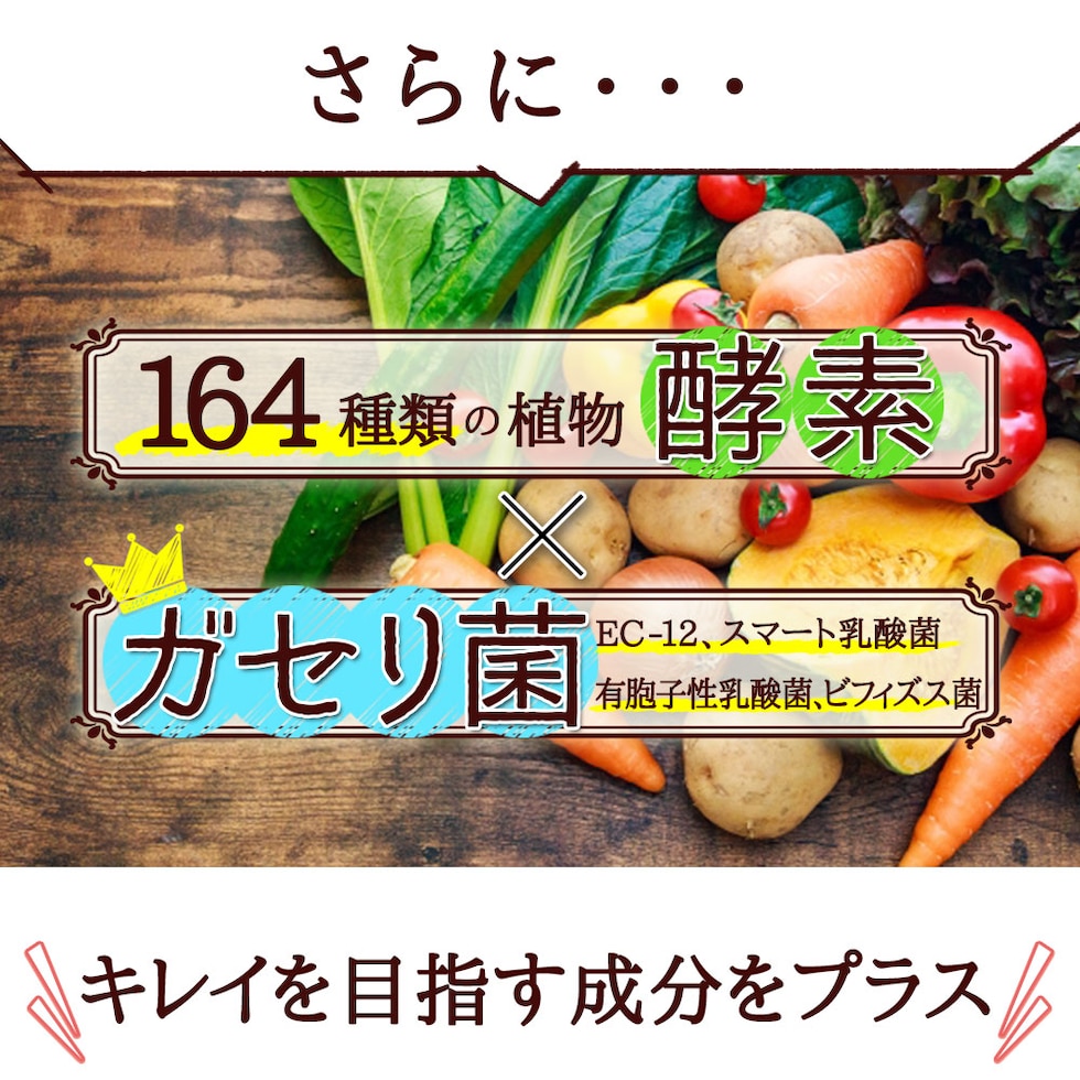 発酵紅茶エキス末(デキストリン、発酵紅茶エキス)(国内製造)、難消化性デキストリン、乳酸菌末、乳酸菌乾燥粉末(澱粉、乳酸菌乾燥原末)、乳酸菌(デキストリン、還元澱粉糖化物、乳酸菌(殺菌))、有胞子性乳酸菌(乳糖、有胞子性乳酸菌)、植物発酵エキス末(デキストリン、糖蜜、黒砂糖、ヨモギ、ウコン、その他)(リンゴを含む)、ビフィズス菌末(澱粉、ビフィズス菌)(乳成分を含む)/セルロース、ステアリン酸カルシウム、微粒酸化ケイ素、ビタミンC、リン酸三カルシウム