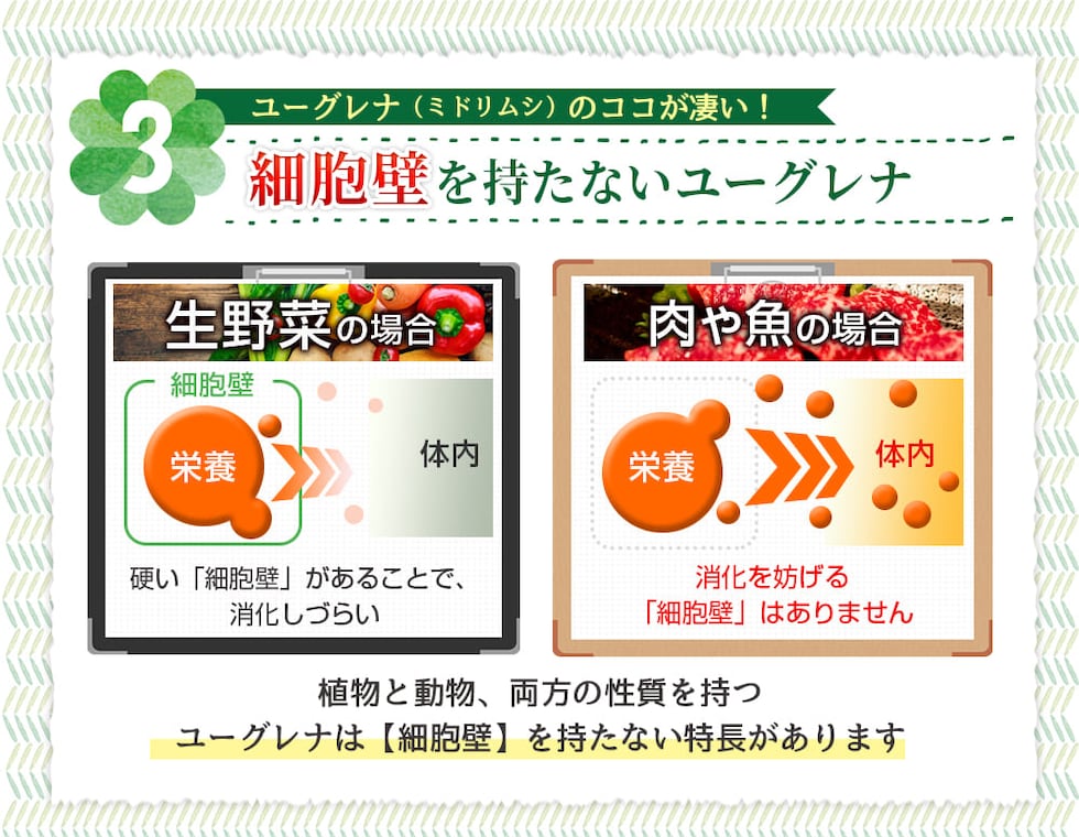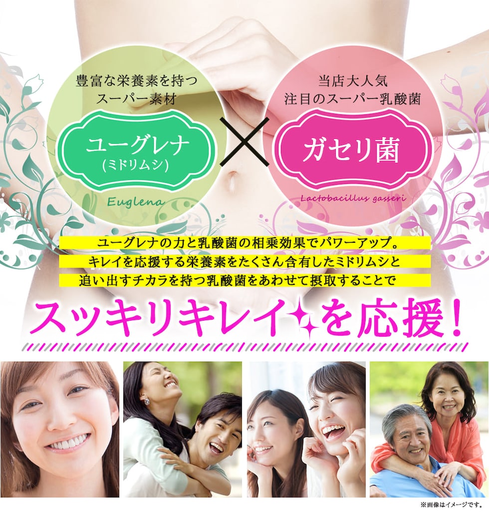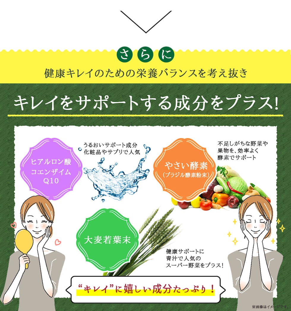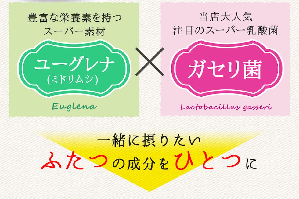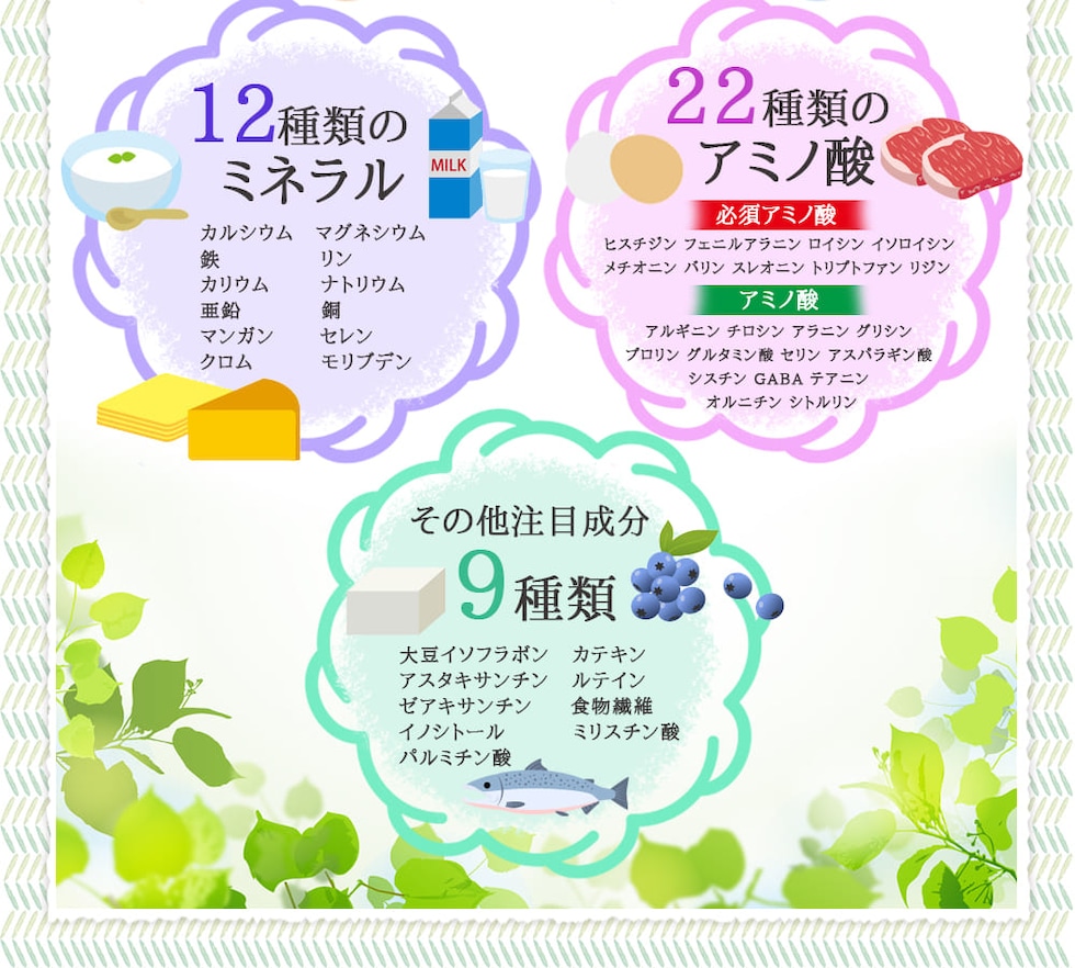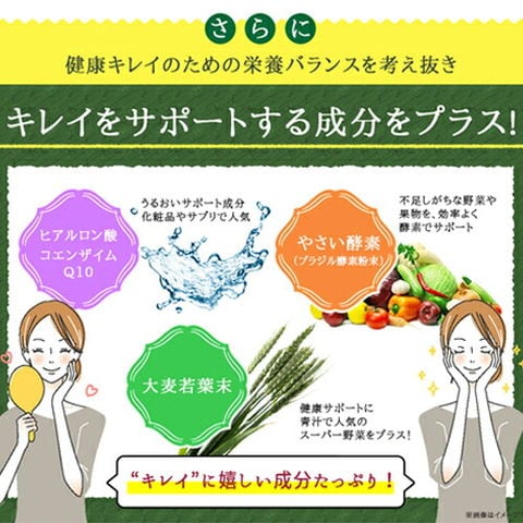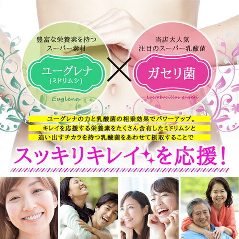 ユーグレナ末(アメリカ製造)、乳酸菌乾燥粉末(澱粉、乳酸菌乾燥原末)、植物発酵物乾燥粉末(デキストリン、植物発酵乾燥粉末)(オレンジ・キウイフルーツ・バナナ・りんご・大豆・ゴマ・カシューナッツを含む)、コエンザイムQ10、大麦若葉末/セルロース、ステアリン酸カルシウム、微粒酸化ケイ素、ヒアルロン酸