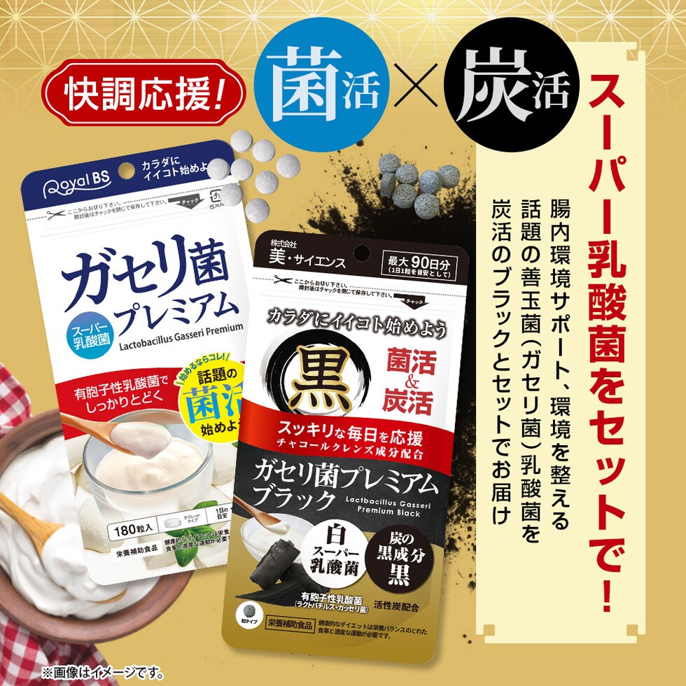 ラフィノース(甜菜糖蜜、ショ糖)(国内製造)、ラクトバチルス・ガッセリ菌、醗酵黒タマネギ、乳酸菌、黒胡椒抽出物、醗酵黒ニンニクパウダー、ブラックジンジャー抽出物(ブラックジンジャー抽出物、デキストリン)、コレウスフォルスコリ末、黒酢もろみ末/セルロース、トレハロース、活性炭、ステアリン酸カルシウム、微粒酸化ケイ素、糊料(ペクチン)(りんご由来)、シクロデキストリン