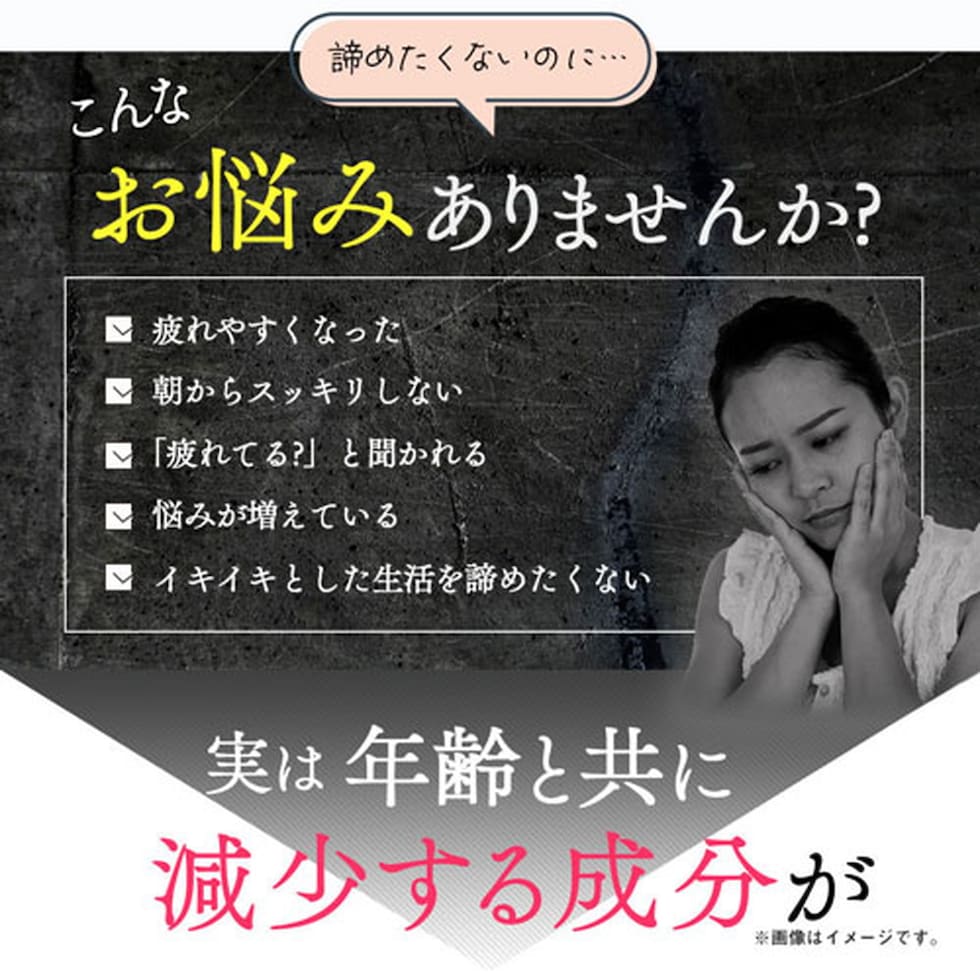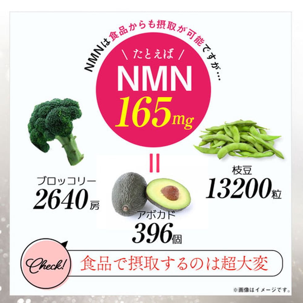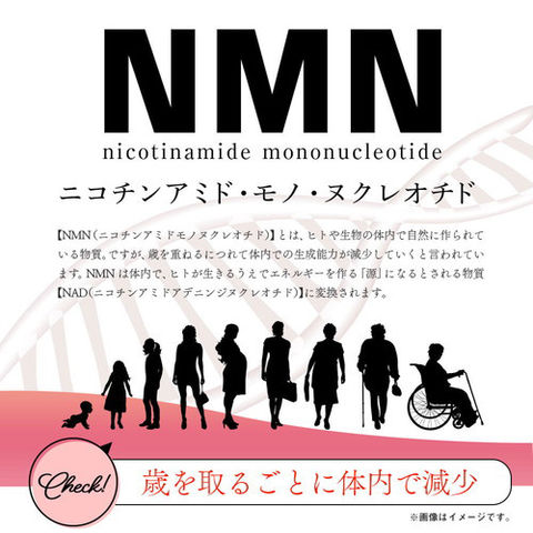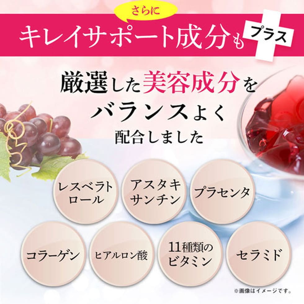 β-ニコチンアミド・モノヌクレオチド(国内製造)、でん粉、硬化ナタネ油、リンゴンベリー抽出物(レスベラトロール含有)、豚プラセンタ抽出物、コラーゲンペプチド、トウモロコシ抽出物/ヒアルロン酸、ヘマトコッカス藻色素、ビタミンC、抽出ビタミンE、ナイアシン、パントテン酸カルシウム、ビタミンB1、ビタミンB6、ビタミンA、ビタミンB2、葉酸、ビタミンD、ビタミンB12 、(一部に豚肉、ゼラチン含む)