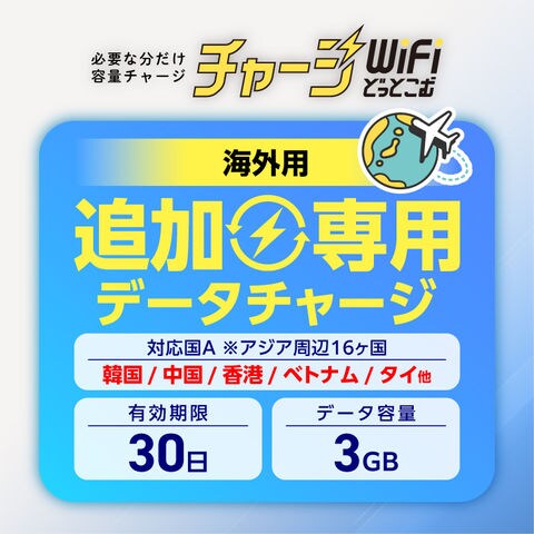 【追加チャージ専用】3GB 有効期限30日 アジア周辺 16ヶ国に対応 韓国 中国 香港 ベトナム タイ 他 容量チャージ 追加ギガ データ 月額0円 設定不要 すぐに使える チャージWiFiどっとこむ