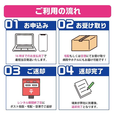商品をお受け取りいただきましたら、Wi-Fiルーターの電源をONにするだけでご利用いただけます。