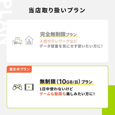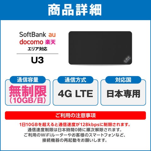 | データ容量 | 1日10GB ※超過後は通信速度が128kbpsに制限され、日本時間0時に順次解除されます。 |