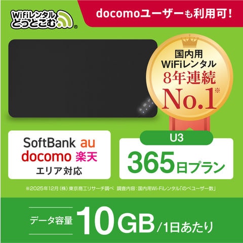 【WiFiレンタル】U3 365日プラン 無制限(10GB/日) 補償付き ポケットwifi wi-fiルーター docomo Softbank au 楽天 マルチキャリア対応 入院 国内旅行 出張 テレワーク 自宅利用