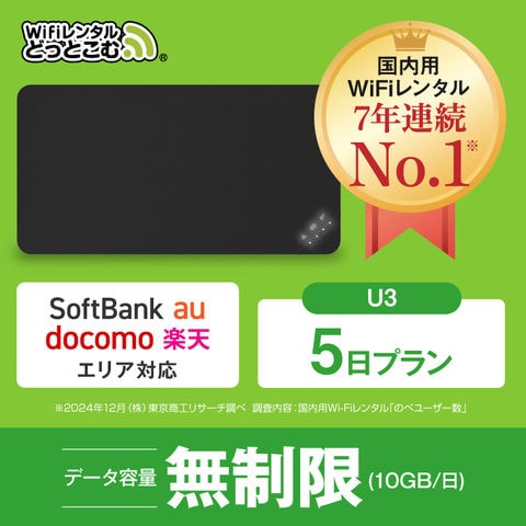 【WiFiレンタル】U3 5日プラン 無制限(10GB/日) 補償付き ポケットwifi wi-fiルーター docomo Softbank au 楽天 マルチキャリア対応 入院 国内旅行 出張 テレワーク 自宅利用