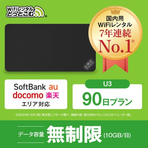 【WiFiレンタル】U3 90日プラン 無制限(10GB/日) 補償なし ポケットwifi wi-fiルーター docomo Softbank au 楽天 マルチキャリア対応 入院 国内旅行 出張 テレワーク 自宅利用