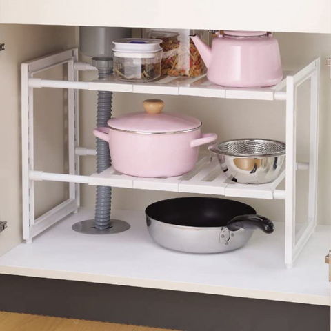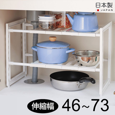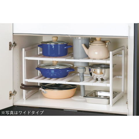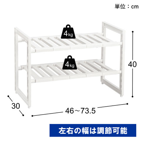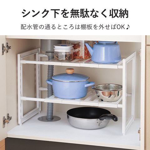 | シンク下を使いやすくスッキリ収納。 用途に応じて幅は46~73.5cmに調整可能。 シンク下の排水トラップを避けて棚板が外せるラックです。 耐荷重は合計で最大8kgです。(上段:4kg、下段:4kg) キッチンのシンク下の他に、洗面台下やクローゼット、押し入れ収納にも活用できます。 |