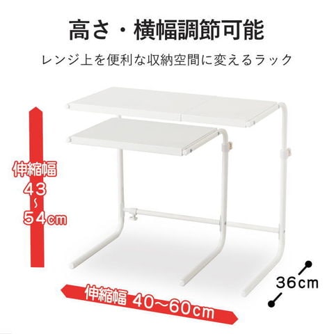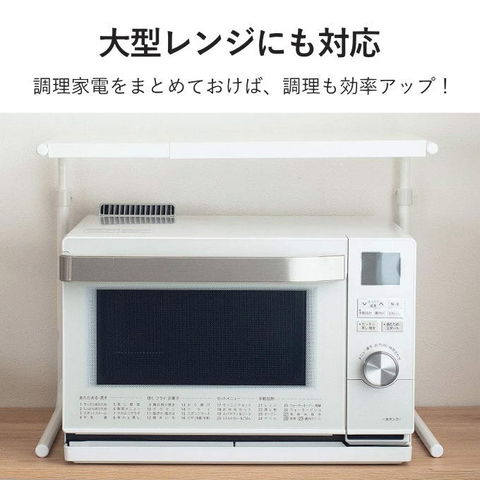 | 電子レンジの上を便利な収納空間に変えるラックです。調理家電をまとめて置けば、調理スペースも広がり効率アップします。 高さ・幅調節ができるので収納したいスペースの場所により、ぴったりと収納することができます。 |