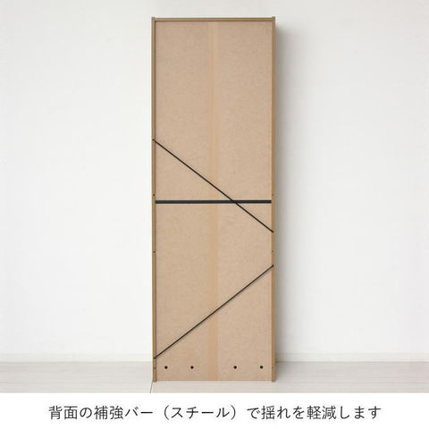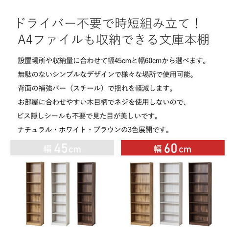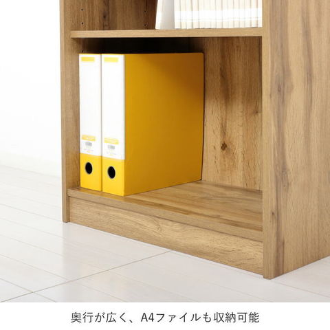 | ドライバー不要で楽々組立。ネジ・ドライバー不要で作業時間を短縮できます。 無駄のないシンプルなデザインで、様々な場所へ設置可能です。 可動棚3枚付きで収納物に合わせて高さを変えられます。(※固定棚2枚) 奥行がたっぷりあるため、A4ファイルも収納可能です。 ネジを使用しないので、ビス隠しシールも不要で見た目が美しいです。 背面の補強バー(スチール製)で揺れを軽減します。 お部屋に合わせやすい木目柄でホワイト・ナチュラル・ダークブラウンの3色からお選びいただけます。 |