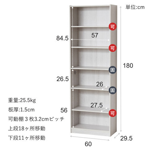 | 組立式 可動棚:上段/3.2cmピッチ18ヶ所移動、下段/3.2cmピッチ11ヶ所移動 |