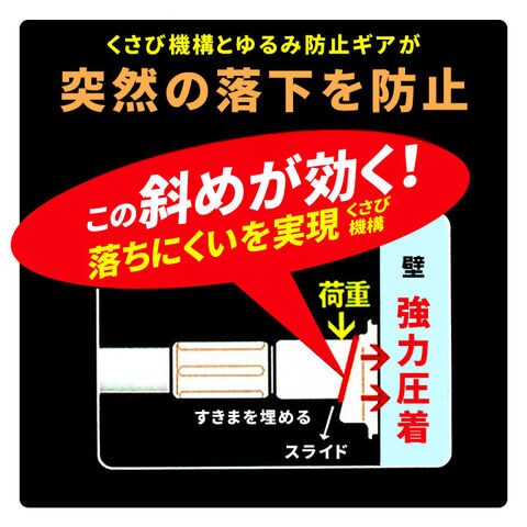 ワイドタイプの超強力伸縮ラックで収納力ぐーんとUP 取り付け範囲119cm~200cm、棚幅35cmのワイドな収納が可能な強力伸縮ラック 洗面所や押し入れ、トイレなどのデッドスペースをフル活用 ●空間を活かし収納力アップ! トンボ 超強力伸縮ラック ワイド! ●古くから利用されている「くさび」を用いて考案し、落ちにくいを実現しました ●棚幅ワイドで収納力アップ! ティッシュペーパーやトイレットペーパーを3個並べて収納できます ●ゆるみ防止ギア付き! グリップ部分には、振動などによる逆回転を防止する歯車を内臓しています ●ネジやクギを使わず、壁などにしっかりと固定できます ●自分だけの空間作りをサポートする収納用品です ●十分な強度のある場所に取り付けてください。石膏ボード、砂壁、内部に空洞のある壁などには取り付けないでください。 |