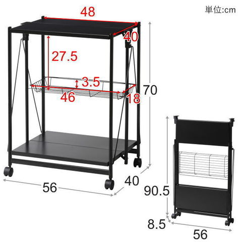| 幅56×奥行40×高さ70cm 天板・棚サイズ:幅48×奥行40cm 折りたたみ時:幅56×奥行8.5×高さ90.5cm 網棚内寸:幅46×奥行18×高さ3.5cm 網棚内寸(上):幅46×奥行18×高さ27.5cm |