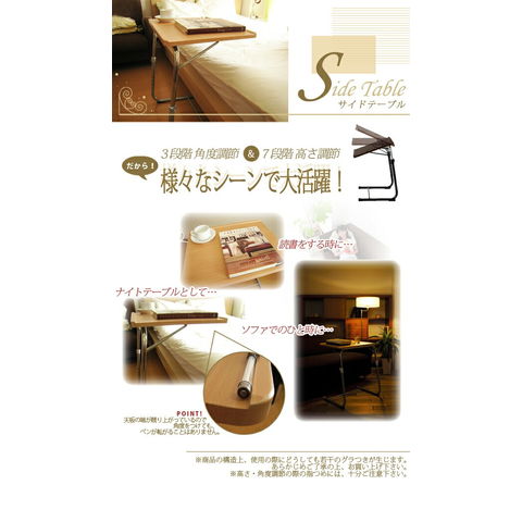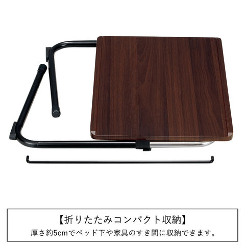 | ベッドサイドやソファーサイドで自分の好みの高さや位置に調節できるところが便利。 角度も変えられるのでノートパソコンや読書、タブレットでYOUTUBUを見たりするのにもピッタリです。 引き寄せて使えるデザインなのでベッドやソファー等、1台あると便利なテーブル。 コンパクトに畳んで持ち運べるのでアウトドアにも活躍できるマルチなテーブルです。 折り畳むと、約6cm程の厚さに。 ソファやベッドの下など、わずかな隙間にサッと収納できる。 車のトランクにもラクラク入るので、アウトドアでも大活躍! |