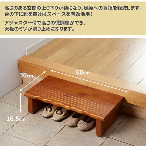 高さのある玄関の上り下りが楽になり、足腰への負担を軽減します。 台の下に靴を置けばスペースを有効活用! アジャスター付で高さの微調整ができ、 天板のミゾが滑り止めになります。