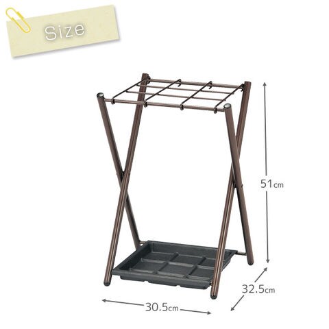 ■サイズ 幅305×奥行325×高さ510mm 受皿:幅220×奥行290mm ■材質 フレーム:スチール(φ19.1mm)、粉体塗装(ブラウン) 受皿:樹脂成型品(ブラック) 傘枠:スチール、粉体塗装(ブラウン) ※一部お客様組立 |