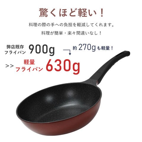 | 軽くて丈夫で使いやすい!軽量EXフライパンシリーズ 熱変形に強いアルミダイキャスト製で、ハンドル部分が一体成形なので、お手入れも簡単です。外面には汚れが落ちやすいセラミック加工も施しております。 キズに強くこげつきにくい内面マーブル×ダイヤモンドコートで、耐摩耗試験50万回クリア! ※JIS S 2010試験に準ずる(一般財団法人日用金属製品検査センター調べ)金属ヘラもOKです。 ※角の丸い滑らかなものをご使用ください。 フライパン内面には、ダイキン工場のふっ素塗料「Silkware」を使用しております。 ※「Silkware」はダイキン工業株式会社の商標です。 ご注意:オーブン・電子レンジには使用しないでください。 つけ置き洗いや食器洗い乾燥機には使用しないでください。 |