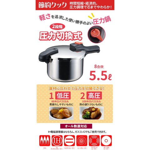 節約クック ステンレス製圧力切替式 片手圧力鍋5.5L
