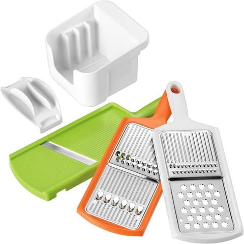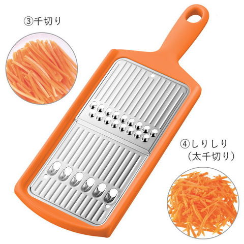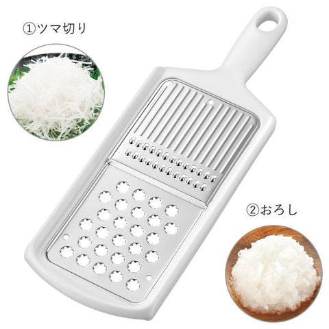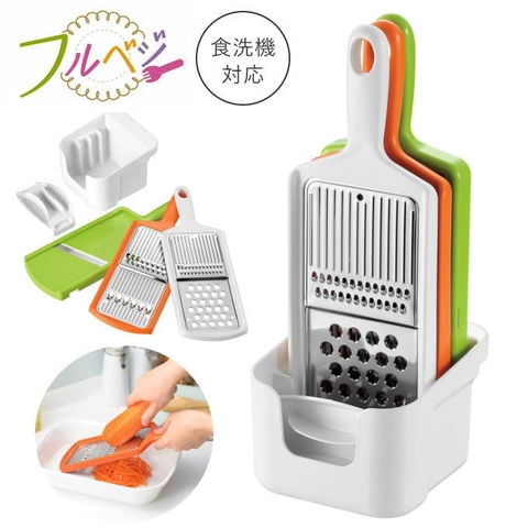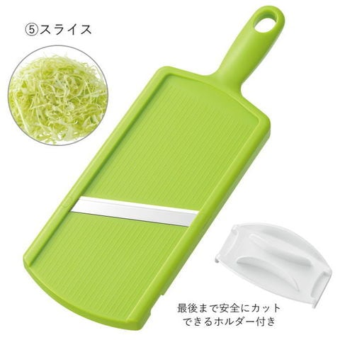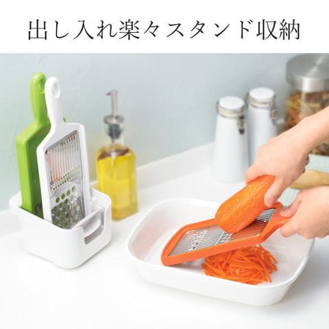 | 5種類の下ごしらえが手早くできる。 まな板いらずで5種類のカットができる。 ツマ切り・おろし・千切り・しりしり・スライス 出し入れ楽々スタンド収納 食洗機OK! |