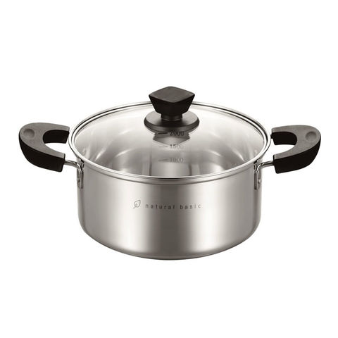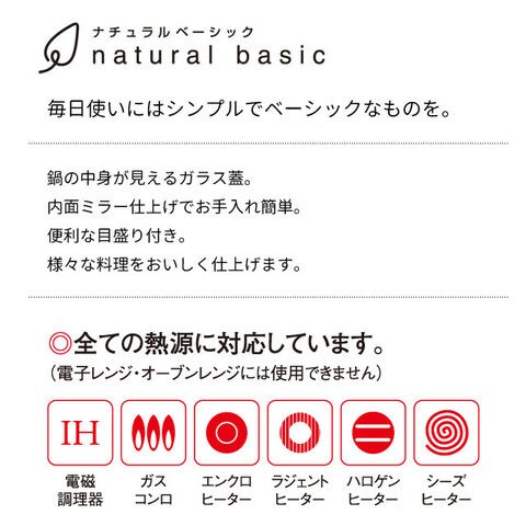 | 毎日使いにはシンプルでベーシックなものを。 鍋の中身が見えるガラス蓋。 内面ミラー仕上げでお手入れ簡単。 便利な目盛り付き。 様々な料理をおいしく仕上げます。 | |
