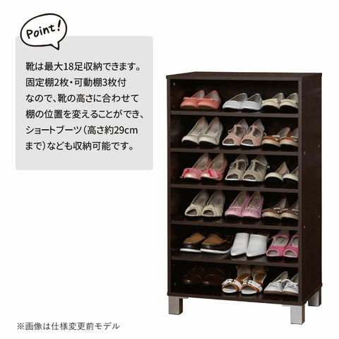 | 靴は最大18足収納可能。移動棚で靴の高さに合わせて棚の位置を変えることができ、ショートブーツ(高さ約29cmまで)なども収納可能。脚を外せば2台積み重ねることができるので収納力がアップします。 ・固定棚2ヶ所、可動棚3枚(3.2ピッチ3ヶ所移動) ・2台を連結したときの高さ 約198cm |