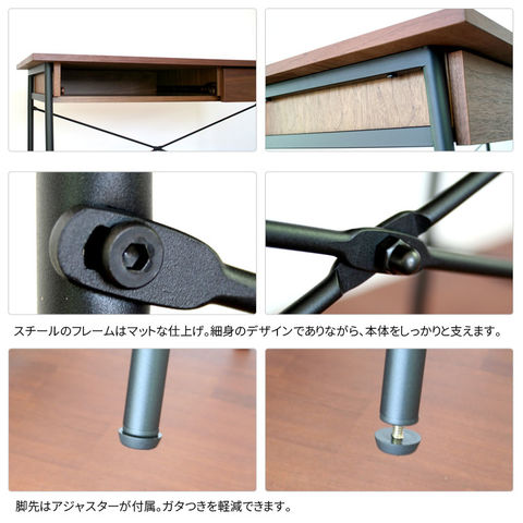 | 木とスチールが融合した美しいバランスが魅力的なanthemシリーズです。幅100cmとお部屋に圧迫感を与えず、コンパクトなデスクをお探しの方にぴったり。 引出し2杯付き。引出しが2つに分かれているため、収納が大変しやすく便利です。 スチールのフレームはマットな仕上げ。細身のデザインでありながら、本体をしっかりと支えます。 脚先はアジャスターが付属。ガタつきを軽減できます。 | |